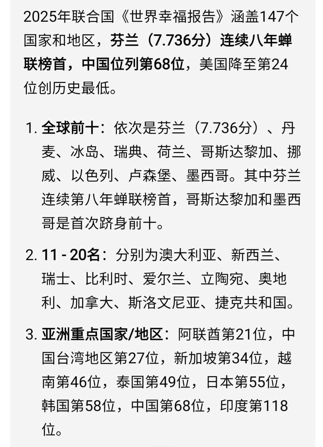 走出“斩杀线”,关心“抑郁线”。 近日网上很多人关心与议论“斩杀线”。一位美国朋友指出,其实在美国发生斩杀线事件的概率很低。我多年研究真业心学,以我的观察看,无论在美国还是中国,斩杀线只与极少数人有关,大多数人都与“抑郁线”有关,且大多数人都会碰到。 什么是“抑郁线”?即哪些处在幸福线与斩杀线之间上不去又没坠落到底而混日子的人群,主要指两种人,一是物质与精神都上不去又没坠落到底的人群,二是物质上去了但精神上不去又没坠落的人群。 从精神上看,这些人具狭隘偏激反智思维,德智勇及自我心理管理能力不够不全面,不懂世界文明精粹的人文智慧与美学修养,不懂爱与慈悲。其中不少人还是狭隘民族主义、民粹,具乌合之众特征。 据联合国全球幸福榜排名(见图2),美国排24位,中国台湾27,中国大陆68位。可见我们中间的抑郁线人群远超美国。 我看身边那些热烈谈论美国斩杀线的人大多都是抑郁线的人。建议这些网友多关心抑郁线,想想如何突破抑郁线,全面提升心智修养,实现幸福人生。否则浑浑噩噩浪费一生,与斩杀线遭遇的人有多区别? 各位有啥看法?@真业心学创始人东方赢 欢迎评论。