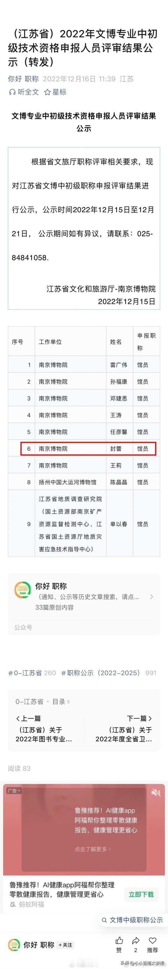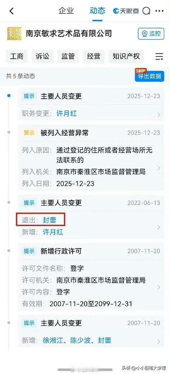 亚洲周刊又爆大料!真的很炸裂!徐副院长前脚被带走调查,他的儿子经营的公司就立刻做了人员变更。退出的“封雷”,新增了“许月红”。 网友,注意到为什么选这个关键节点? 这个人要选择退出,那肯定是有猫腻? 结果有网友立即爆料:“想必也已关注到封蕾和南博的关系!” 就在大家好奇“封雷”又是谁的时候? 亚洲周刊通过网友的提示,立刻利用互联网去追寻这个人的踪迹,不查不知道,一查才发现网友说的太对了,这个“封雷”的真实身份是属于南博的馆员,后来还身兼多职! 那这事就有点意思了,这里面的水真的很深啊,真是越挖越有料啊,这是否涉嫌内外勾结?一进一出一条龙服务呢? 看来 郭礼典老师肯定知道很多内幕。 看来“封雷”,这个人也应该查一查了。