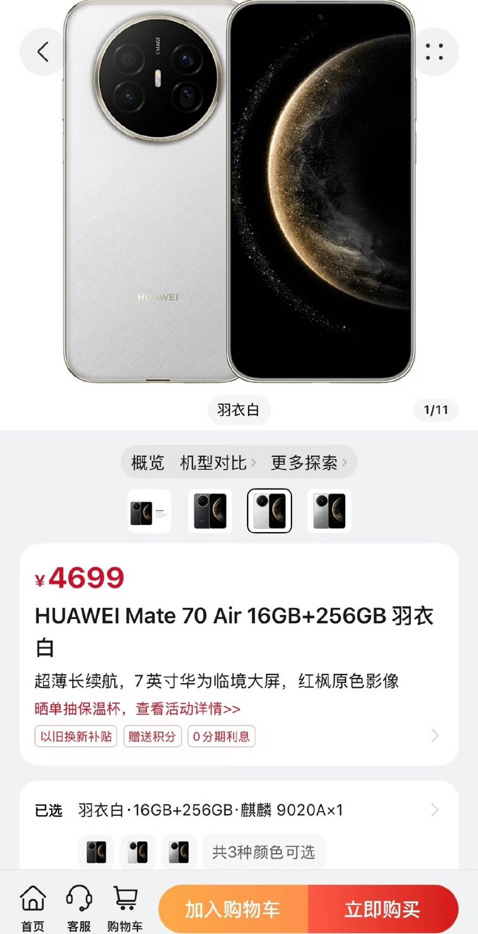 华为Mate70Air16GB内存版开售16GB内存,4699元起的价格搭配麒麟