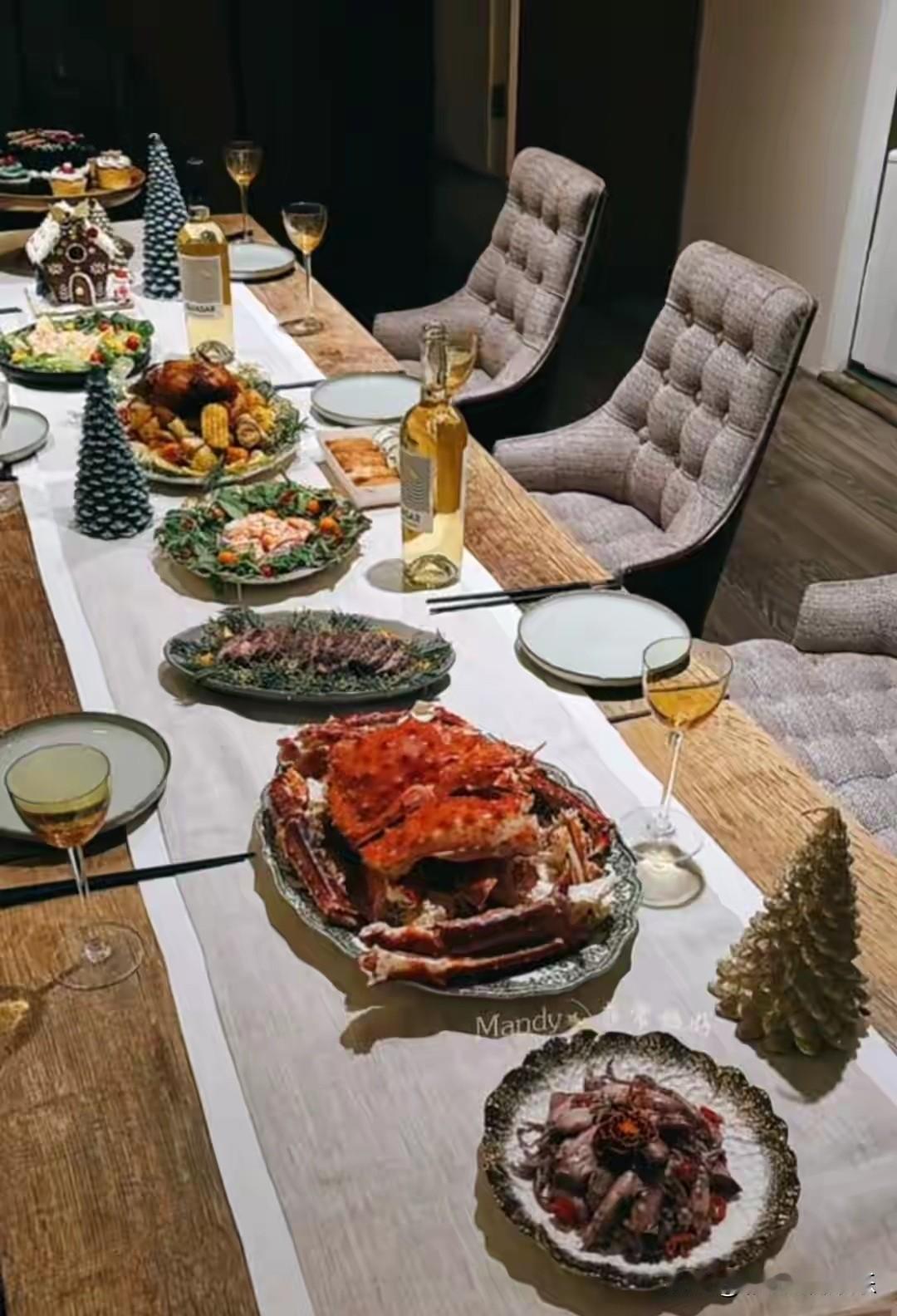 没想到汪小菲马筱梅圣诞大餐这么丰盛,帝王蟹海鲜大餐茅台酒摆满桌子,实在太壕了。 马筱梅太贤惠了,整一桌子美食海鲜找闺蜜一起聚会,她们也带了孩子来玩。 玥儿剪了短发,今年圣诞节真的很嗨,马筱梅已经到了孕晚期,她无论生男孩女孩都可以。 如果生男孩张兰会开心,如果生女孩汪小菲会开心,有人说她是前人种树后人乘凉,有福之人只进有福之家,嫁入豪门过好日子,这都是她的福报。