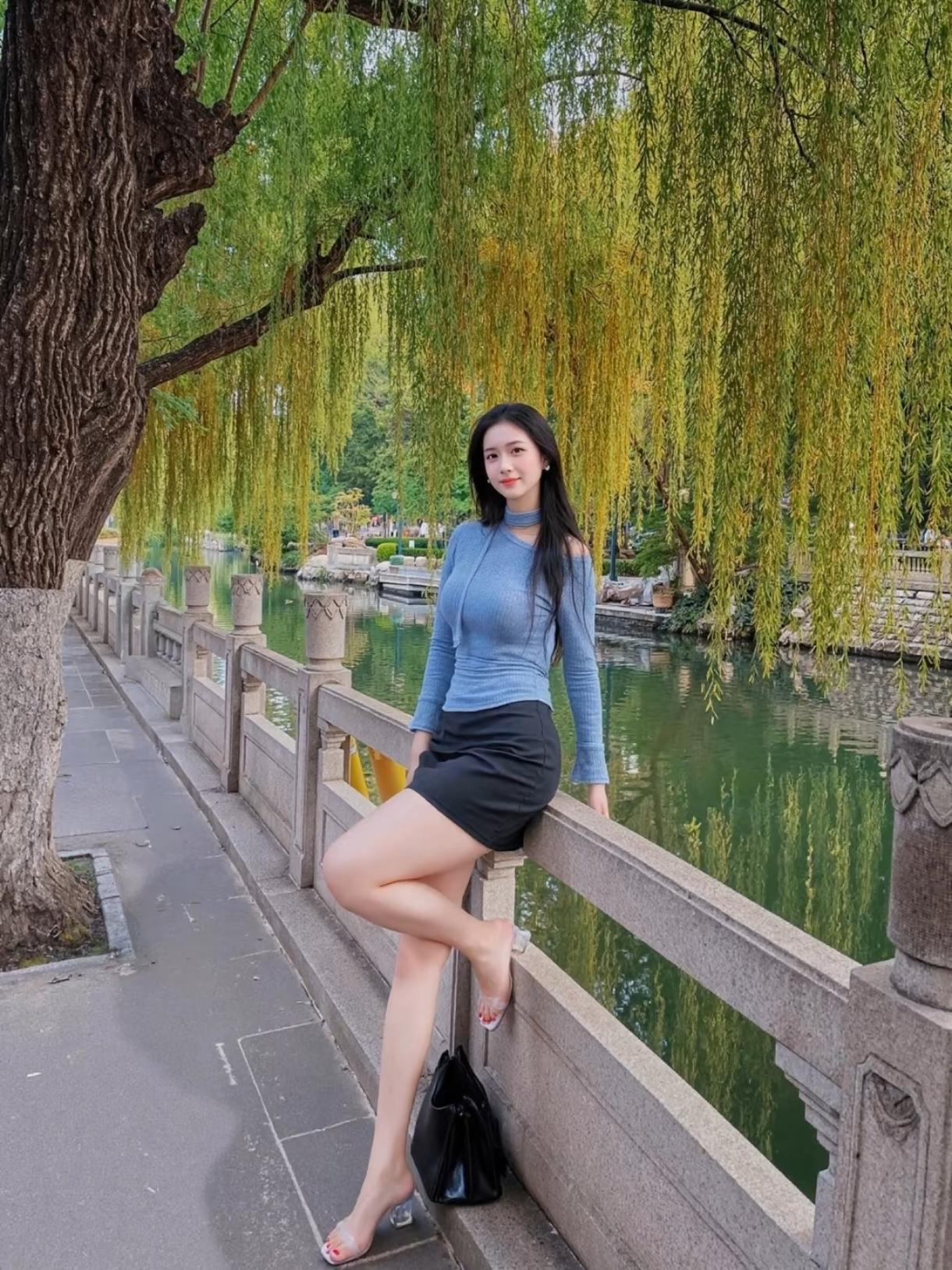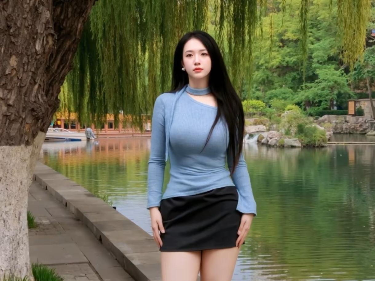 柳岸行 垂柳把绿丝绦垂进湖心 波纹揉碎了半池晴光 石栏边的风绕着蓝衫走 像吻过青瓷的釉,轻缓又温柔 她站在水畔,黑裙裁去了夏的冗长 鞋跟敲着青石板,敲出细碎的韵脚 发丝垂落,与柳丝缠成一缕软烟 目光掠过湖面时,涟漪便多了三分温柔 倚栏的瞬间,腿弯搭住石纹的凉 手提包悬在栏柱,像坠着一粒墨色的星 耳珠的白,是春水未融的月 颈间的蓝绸带,系着一整个江南的软 风掀动衣衫,也掀动湖底的云影 她是柳岸的一枝荷,未开时 已让流水学会了轻唱 让所有路过的光,都肯为她多停半晌 垂柳还在把影子往水里送 她转身的刹那,湖光跟着倾侧 青石板上的脚印,沾着柳香 被风收走,藏进了夏的信笺里