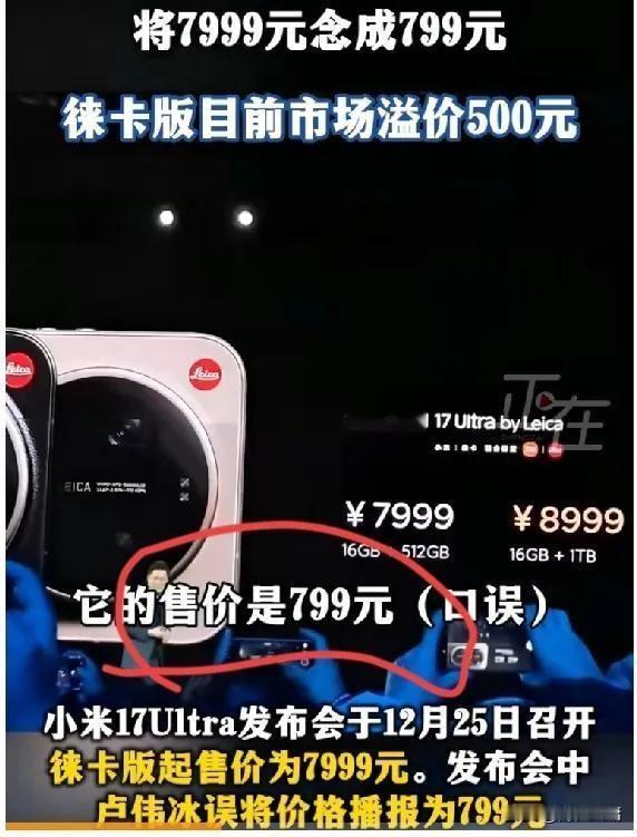 搞雷总心态,799元能买小米17 Ultra?卢伟冰口误引爆全场 “它的售价是799元!”12月25日小米17 Ultra发布会现场,卢伟冰这句口误直接让全场沸腾——谁能想到定位高端的徕卡版新机,竟被报出百元级价格? 台下观众先是愣神,随即爆发出大笑,直播间弹幕更是被“799元全款拿下”的玩梗评论刷屏。卢伟冰立刻拍头更正,坦言把7999元说成799元是口误,还自嘲“这价卖得公司赔本”,轻松化解了尴尬。 这场小插曲让相关话题火速登顶热搜,也带火了新机热度。小米17 Ultra徕卡版16GB+512GB版定价7999元,1TB版8999元,开售后全系迅速售罄,二手平台溢价超20%。原本的口误意外成了免费营销,也让这款搭载徕卡红标、双卫星通信的高端旗舰,成了年末手机市场的焦点。
