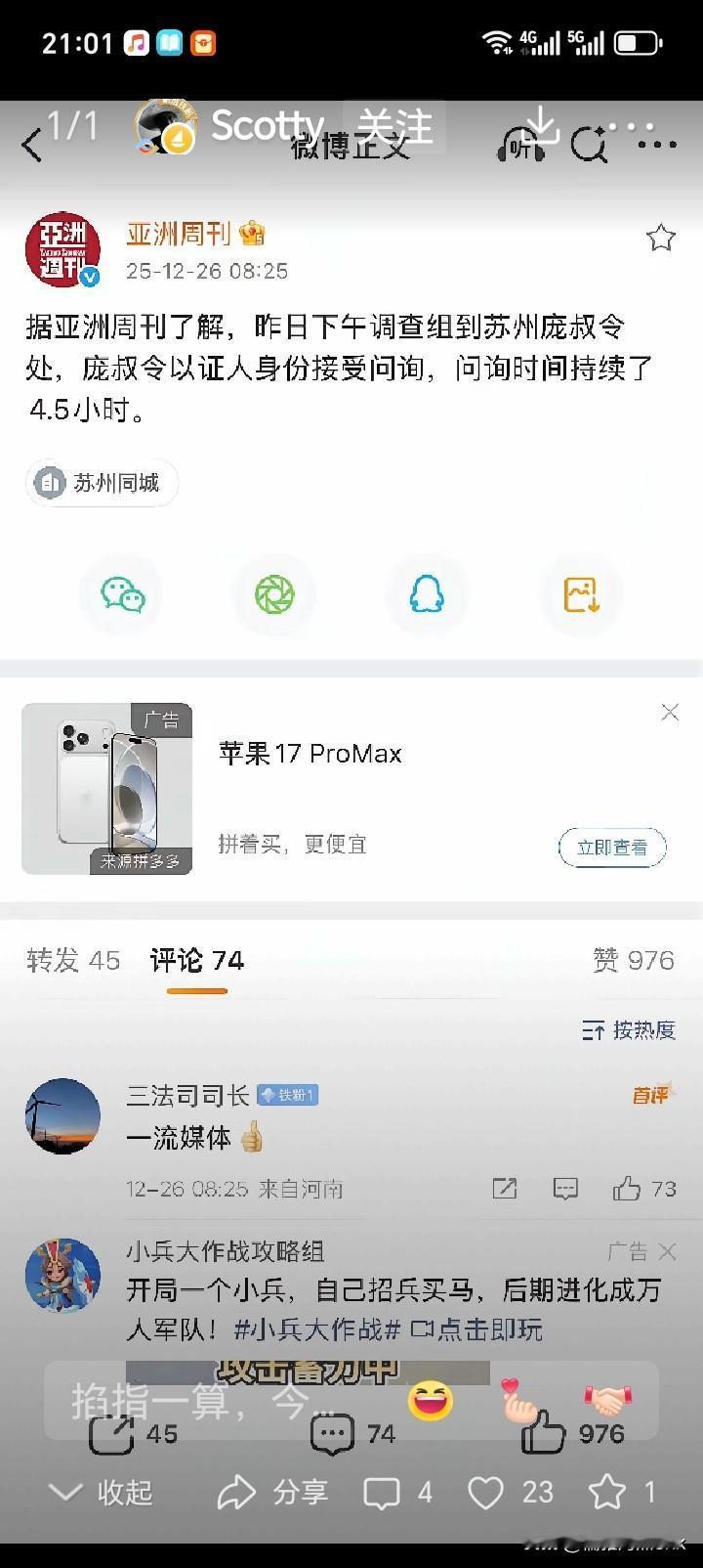 亚州周刊不愧是面向全球华人的新闻媒体,对南博事件的跟进实时高效,频次密集,细节深挖到位,这要是搁内地媒体,肯定是等官宣,啥结果可能不得而知。 亚洲周刊发文内容简短,果断,并不是模棱两可的让人猜,看得人解气。比如,23日,调查组进驻西康宾馆;中午12点30分,徐湖平被带走;24日早上8点,举报人郭礼典被请去西康宾馆问询;郭礼典接到多个恐吓电话;25日,庞叔令尚未接到任何联系她接受调查组问询的信息;下午,调查组到苏州庞叔令处,问询时间长达4.5小时。 像看电视剧本一样,实实在在的推动了事件发展的进程。徐莺虚假身份,陆挺的《江南春》出处,则用插播形式,将证据一条条实锤,并敢于质疑,全网征集更有用的信息佐证,锁定事实。 26日,亚洲周刊发光一条关于徐湖平身世的深度复盘,被平台打上了“不良信息”屏了。网友捕风捉影的猜测被严丝合缝的证据链证实,韩某和江某是他的贵人。有网友还是整理出了人物关系图。 27日,亚洲周刊发文,徐湖平带走的当日,其子徐湘江所经营的艺术品公司被列入经营异常,住所及经营场所无法联系。 这只是开始,涉及的人越扒越多,调查组会有更多结果,盯紧亚洲周刊。 几小时一条动态,甚至几十分钟一条动态,实时跟踪报道,核实证据,没有顾忌,这是内地媒体无法比的,内地有些媒体是看菜下碟,看透不说透。 亚洲周刊这下子火了,就喜欢他这种追踪真相的劲头,庞家人很有想法!