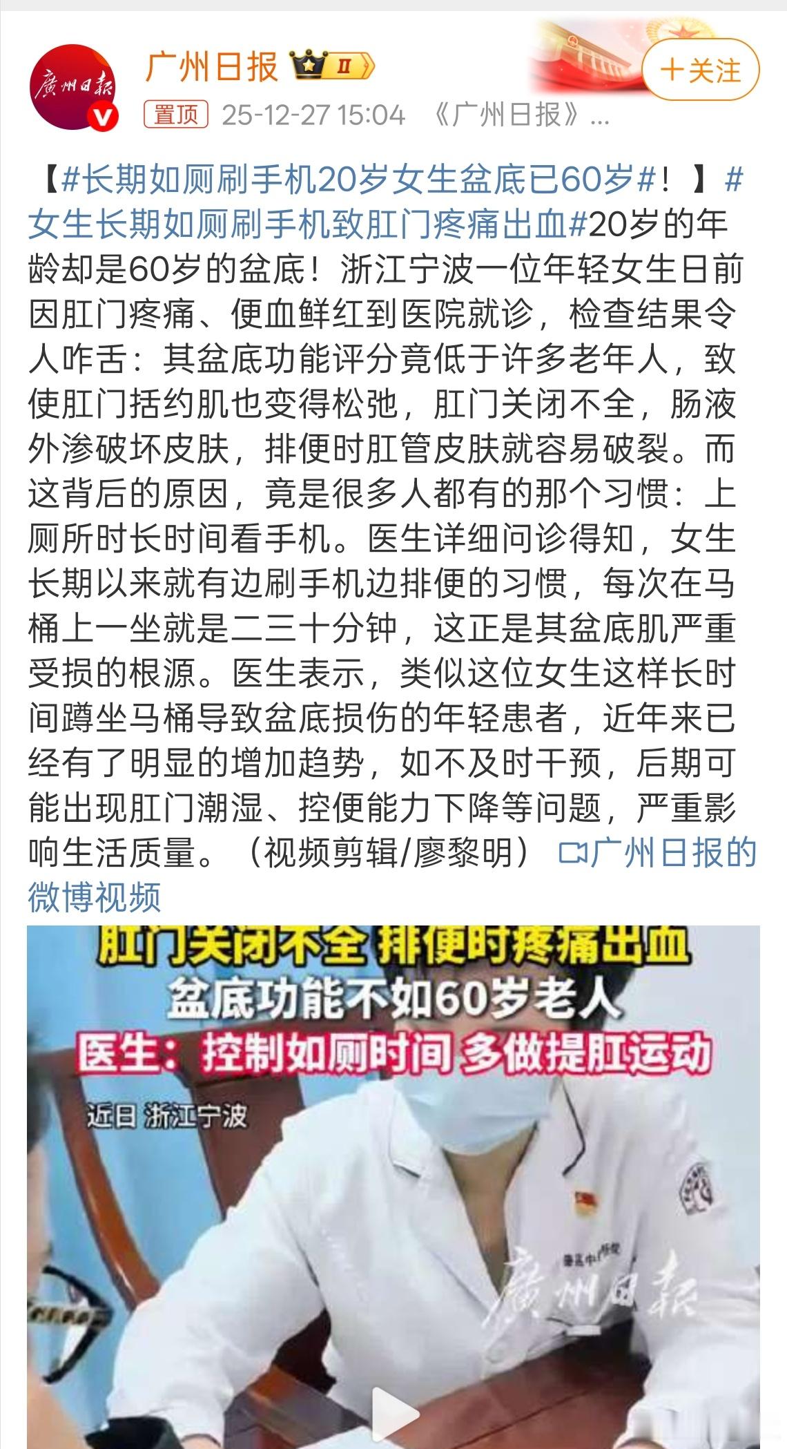长期如厕刷手机20岁女生盆底已60岁 恐怖!看来以后要避免啊!