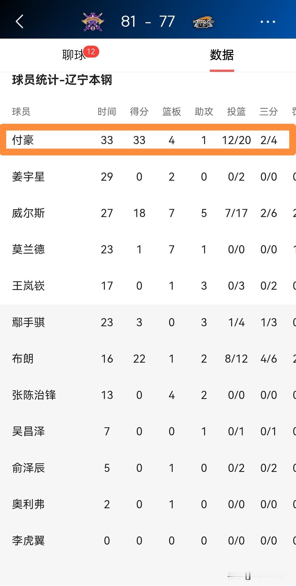 辽宁本钢球员付豪真是虽败犹荣!虽然今天辽宁本钢在客场以77:81憾负北京控股,但是付豪却打出了极具说服力的表现,他对球队是问心无愧的。 整场比赛下来,付豪首发出战33分钟,投篮20中12,其中三分球4中2、罚球9中7爆砍33分4篮板1抢断。 坦白说,以付豪在本场比赛中的表现来看,他绝对对得起他的顶薪合同。