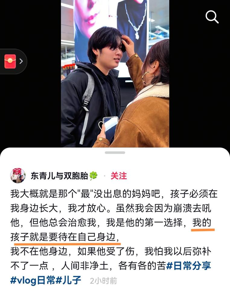 东青的大儿子从新疆回来了。东青去机场接大儿子,一见面母子拥抱在一起,东青轻抚儿子的面颊,呈现出一派母子重逢的温馨画面。 这次重逢看着确实挺感人的,东青自己也说,虽然有时会吼大儿子,但最后还是被儿子治愈。其实这孩子挺让人心疼的,之前为了躲避家里的氛围,宁愿去住舅舅的铁皮房,甚至远走新疆投奔亲爹。 我更在意的是,视频里的温馨到底能维持多久? 毕竟家里有个“小老公”在,两人平时秀恩爱完全没个边界感,这种让大儿子尴尬的相处方式,本身就是一种无形的排挤。 说实话,如果东青还是听信小老公的怂恿,动不动就对孩子横加埋怨,那这种所谓的“归属感”完全就是空中楼阁。 在这种家庭环境里,孩子其实很敏感,他最怕的就是母亲的立场摇摆不定。 我觉得最关键的点在于,孩子要的不是机场一个煽情的拥抱,而是一个能让他踏实待着的、没有偏见的避风港。 如果东青的性格不改,还是被枕边风吹得晕头转向,我感觉现在的和睦可能只是暂时的,过阵子大概率又要故伎重演。 希望这次她是真的想明白了,别让孩子好不容易燃起的这点希望,没几天又被浇凉了。