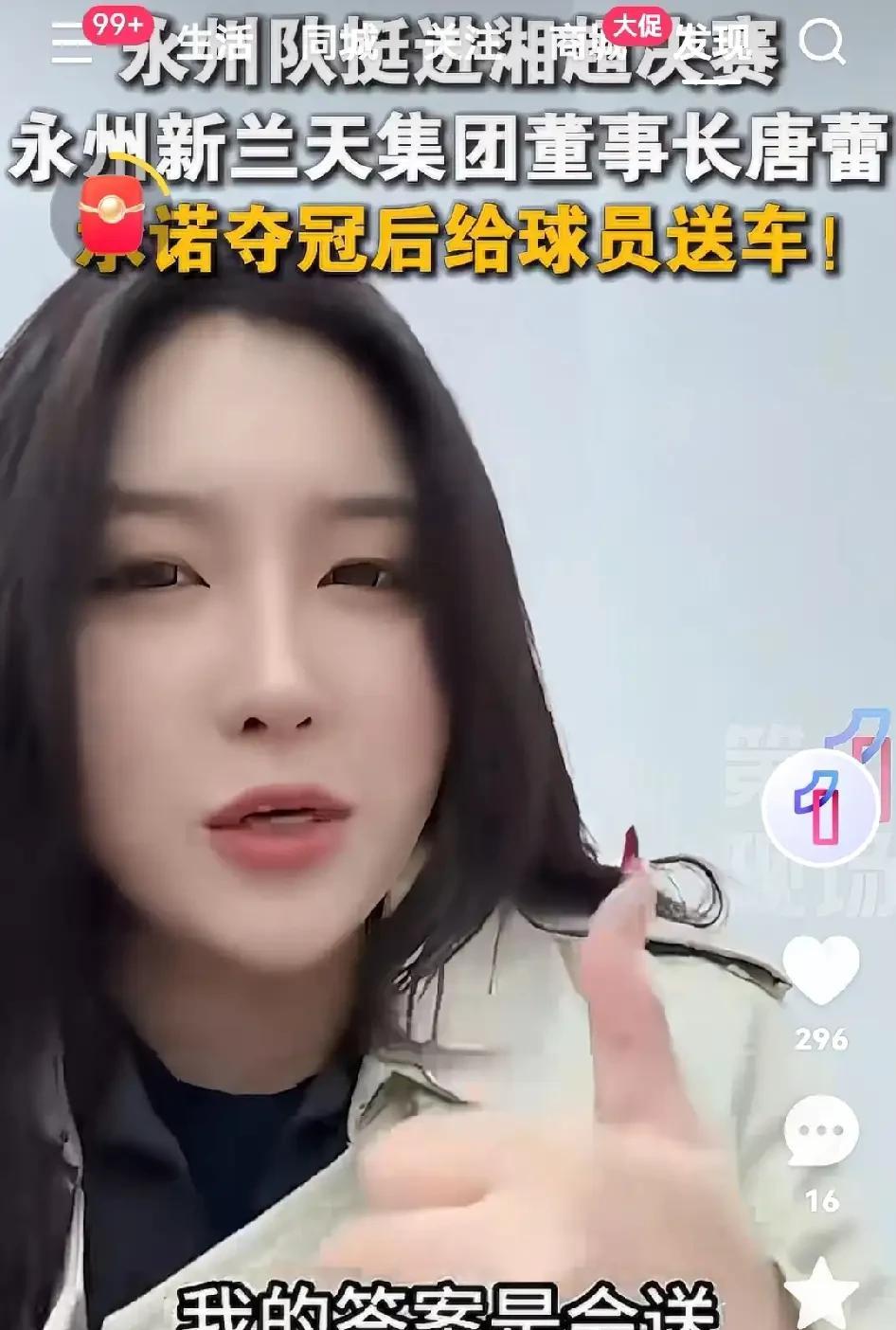 有钱能使鬼推磨!永州美女老板豪气承诺永州队夺冠,每人奖励一台车。在湘超比赛中,不被人看好的永州队奋勇争先,1:0战胜常德队,获得湘超联赛冠军。 有一说一,现在压力来到了美女老板唐蕾这边,永州队已经夺冠,不知道她能不能兑现每人奖励一台车的承诺了。 据报道,现场有43695人观看了湘超决赛,湖南球迷的热情比中超联赛火爆多了。 那么问题来了,您认为有着火爆球市的湖南,应该有自己的职业联赛球队吗?美女老板能不能兑现自己的承诺?#中国足球#