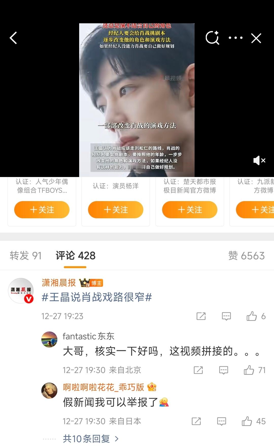 王晶说肖战戏路很窄看图1,你管这叫戏路窄还有据说视频是拼接的,作为媒体不经核实就发布,还搞上黑热搜,合适吗?职业操守都不要了