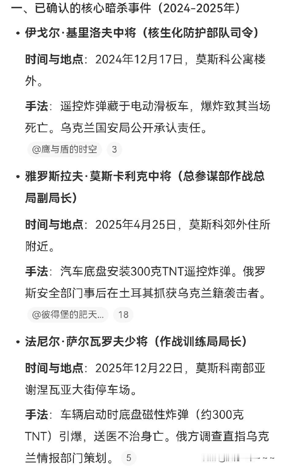 揪心!发现没有,虽然这几年俄乌打仗,俄罗斯在战场上优势比较明显,但是,死的高级将领可不少,虽然下面这一位俄罗斯前国防部副部长多方消息说是由于死于心脏病,但是综合前面死的三位中将,比如:作战训练局局长,总参谋部作战总局副局长,核生化化防护部队司令基本被俄方确定是被暗杀的,而且把实施者都指向了乌克兰。 也就是说目前已知的,俄方已经失去了4位高级将领,而且位置都非常重要,都是作战中的关键核心人物。 所以咱们想想这是什么意思呢?就是乌克兰可能在情报战,实施精准打击方面还是有一定套路的。这俄乌战争都进行了4年了,有听说过几位乌克兰将领是在战场上死去的吗?所以说,仔细一想,还是为俄罗斯捏了一把汗,挺揪心的。[捂脸]