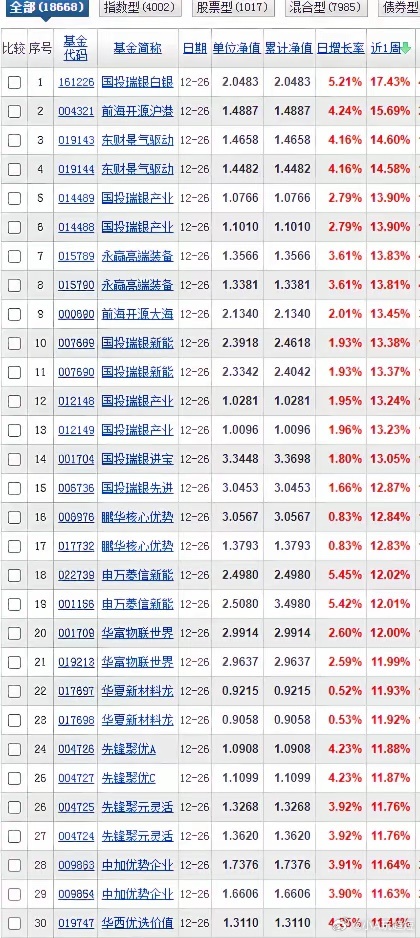 周榜第一还是国投瑞银白银期货,也就是说这期3月榜,1月榜和周榜的冠军都是国投瑞银白银期货。周榜的变化历来都是最大的,往往上一期的前100名都很难出现在下一期的榜单上。国投瑞银白银能连续霸3份榜,第一说明它连续上涨的时间已经很长,中途也并没有碰到很深的调整。第二持有人数越来越多。套利的情况也很严重。这段时间限购的消息也越来越多,白银的涨幅已经大幅领先黄金。周榜第二是前海开源沪港深强国产业混合,第三是东财景气驱动,永赢高端装备排第五!