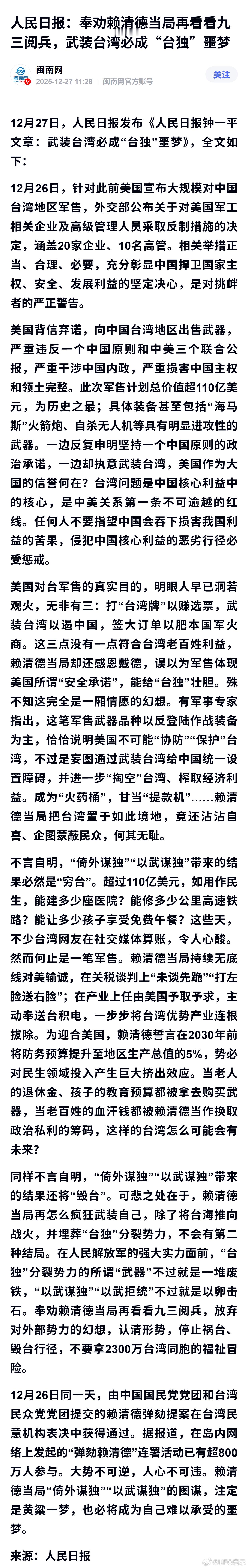 人民日报:奉劝赖清德当局再看看九三阅兵,武装台湾必成“台独”噩梦