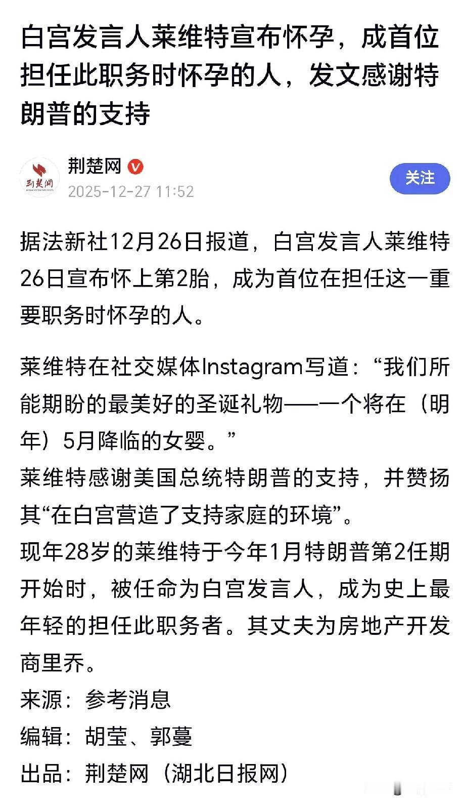看到这则新闻我笑了, 现在是不是没有新闻了,连这个都发出来! 这有什么新闻价值可言, 刚开始还以为是白宫女发言人怀孕, 特别感谢特朗普, 还以为是老特干的好事? 为博眼球还加上“首位”, 实在是想不明白, 现在的媒体都是这样写新闻的吗?