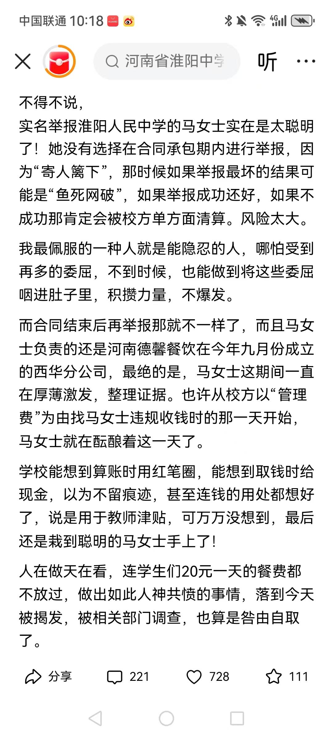 实名举报淮阳人民中学的马女士,实在是太聪明了!内部人士透露,公司去年九月到期就不让干了,但她就是赖着不走。最近领导白某退休了,开始反扑了。 我们这行情是餐饮公司提百分之二十五分包给窗口,收百分之十五,还能赚十个点,不少了。 因为合同到期不让她继续干了,才举报,属于内讧。 两年三百三十万,真的太黑了,让承包者都活不下去了,举报是必然的事。 不要说内讧,从学生嘴里扣出来百分之十五的管理费本身就是违法违纪。 你以为人家傻?能干这活都不是一般人。像这种人,永远不缺商机,别以为所有人都上网,钱也挣够了,回老家也能过逍遥日子。 20块钱的学生餐费都要贪,良心不会痛吗?马女士干得漂亮,这才是真正的为民发声。 全国的学校都一样的,应该搞一场倒查二十年行动,发动群众举报,查证奖励百分之五。