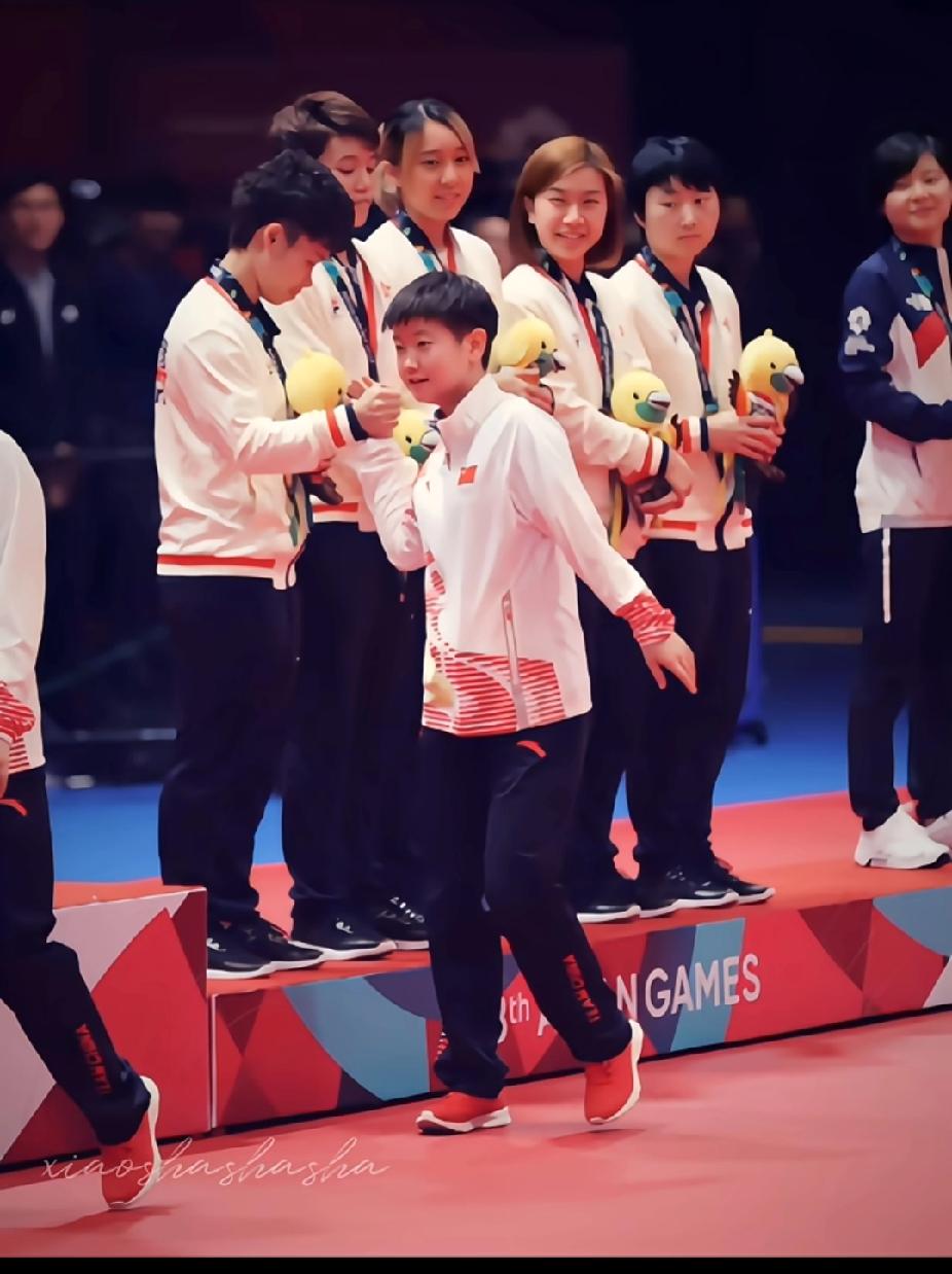 2018雅加达亚运的小莎莎,可爱到心巴上了 翻到2018年雅加达亚运会的孙颖莎,这时候的她才17岁,领奖台上迈着小碎步和人握手的样子,圆乎乎的脸蛋带着少年气的灵动,真的可爱到词穷! 那会儿的她刚拿下女团和混双两枚亚运金牌,赛场上是敢打敢拼的小魔王,赛场下却是全队都想捏脸的小奶包,这份青涩又鲜活的模样,谁看了不心软啊~❤️孙颖莎 国乒