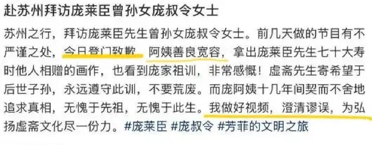 她没等舆论发酵,直接敲开了苏州一扇老宅的门。 门后是庞莱臣的直系后人,庞叔令。老人生活简朴,此前从未直接面对媒体镜头。刘芳菲为当初采访的不严谨,当面道歉。 这不是公关脚本。庞叔令女士随后以证人身份配合了调查,关联苏州正启动的“近代收藏家家族档案整理”专项。她多年低调捐赠文献,守护家族记忆。 正规媒体采访庞氏后人,一度需通过文化部门协调。这次风波后,苏州广电《文化苏州》栏目组已计划进行系统性访谈。 公众紧盯名人之后采访的真实性。而真相比想象更厚重:一个家族的沉默守护,一次媒体的直接抵达。 当流量追逐故事,行动校准砝码。这不仅是一个主持人的纠错,更是一面镜子:照出诚意如何穿过迷雾,抵达尊重。