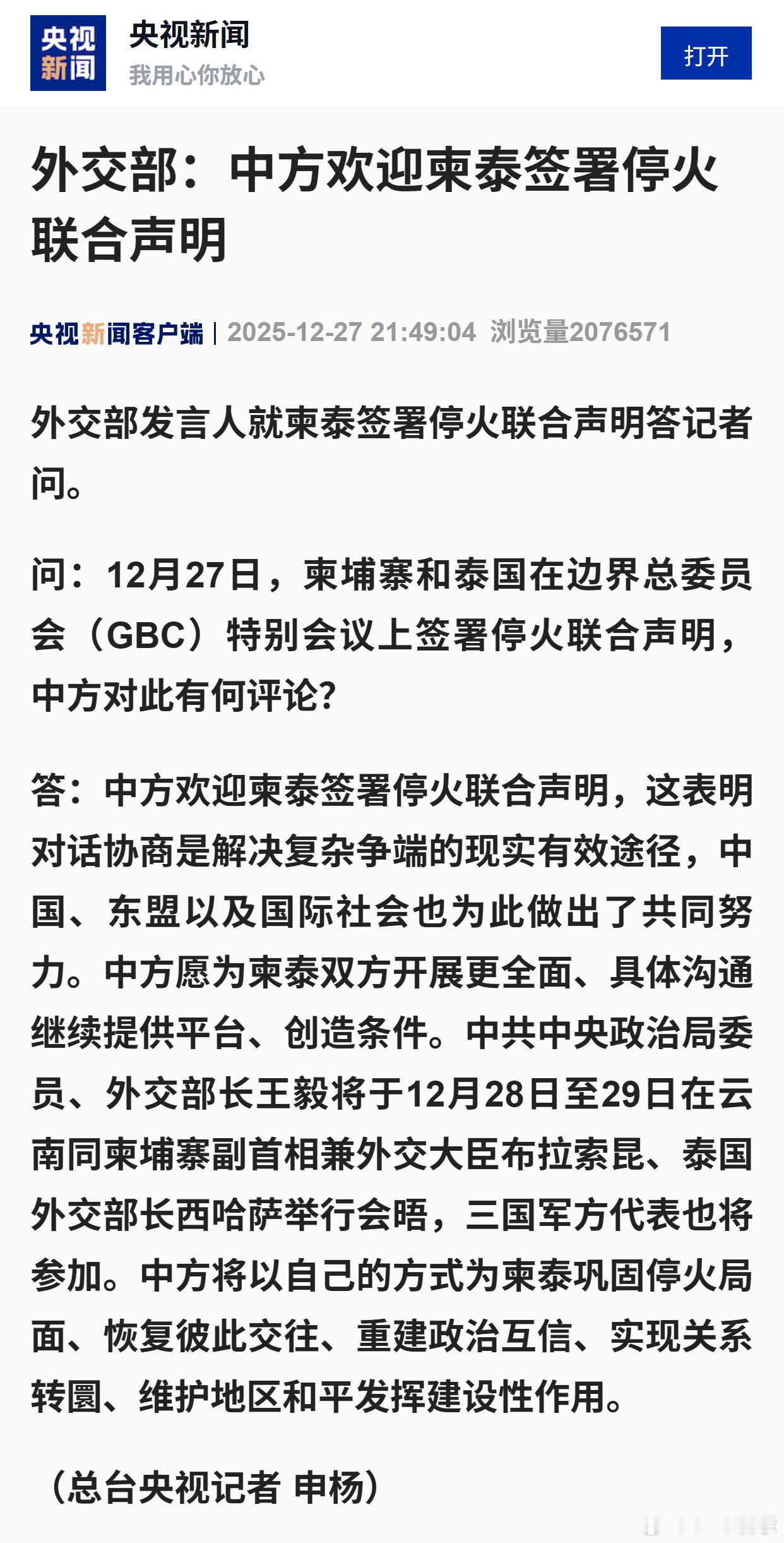 外交部:中方欢迎柬泰签署停火联合声明