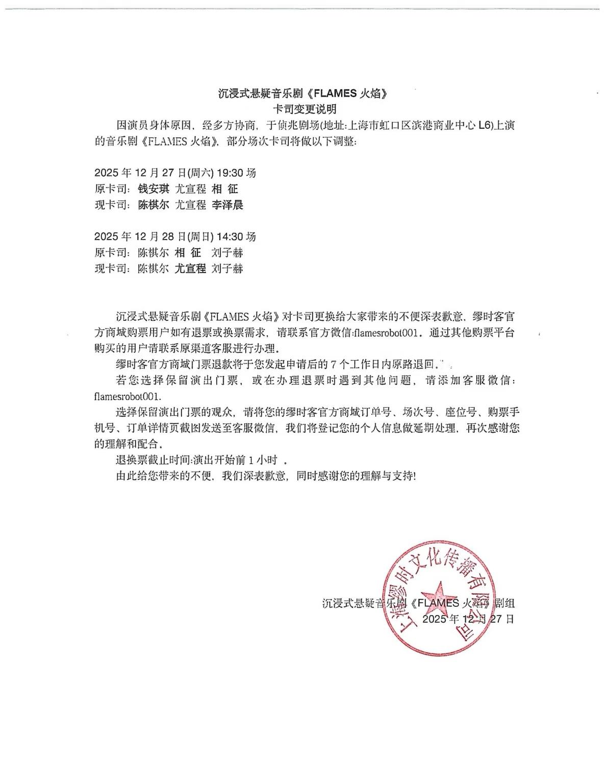 因演员身体原因,经多方协商,于上海市虹口区滨港商业中心L6侦兆剧场上演的沉浸式悬疑音乐剧《火焰》,部分场次卡司将做以下调整。