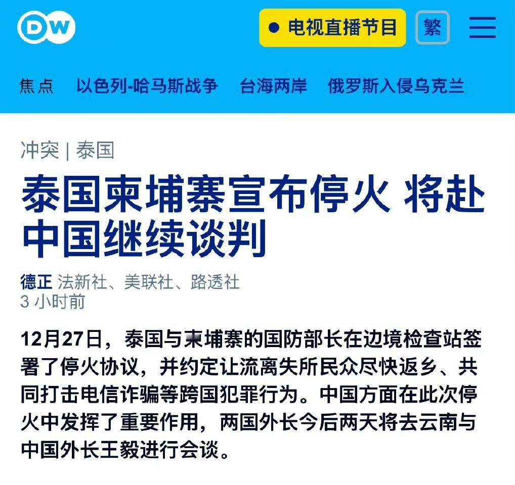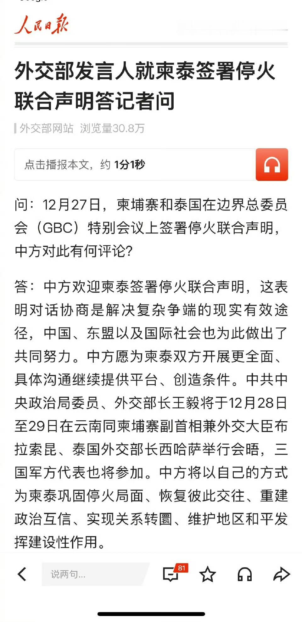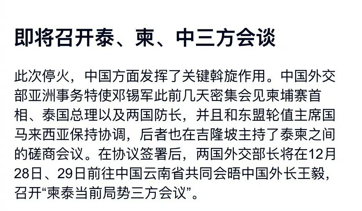 泰国柬埔寨宣布停火,将赴中国继续谈判 “中方将以自己的方式为柬泰巩固停火局面、恢复彼此交往、重建政治互信、实现关系转圜、维护地区和平发挥建设性作用。”