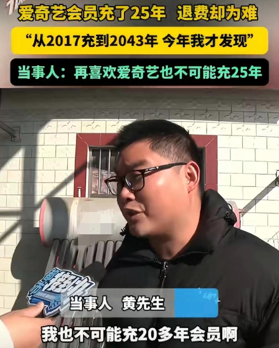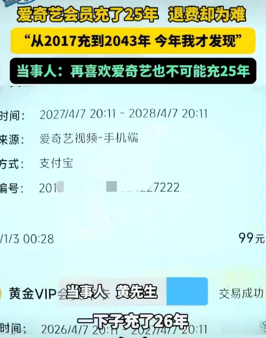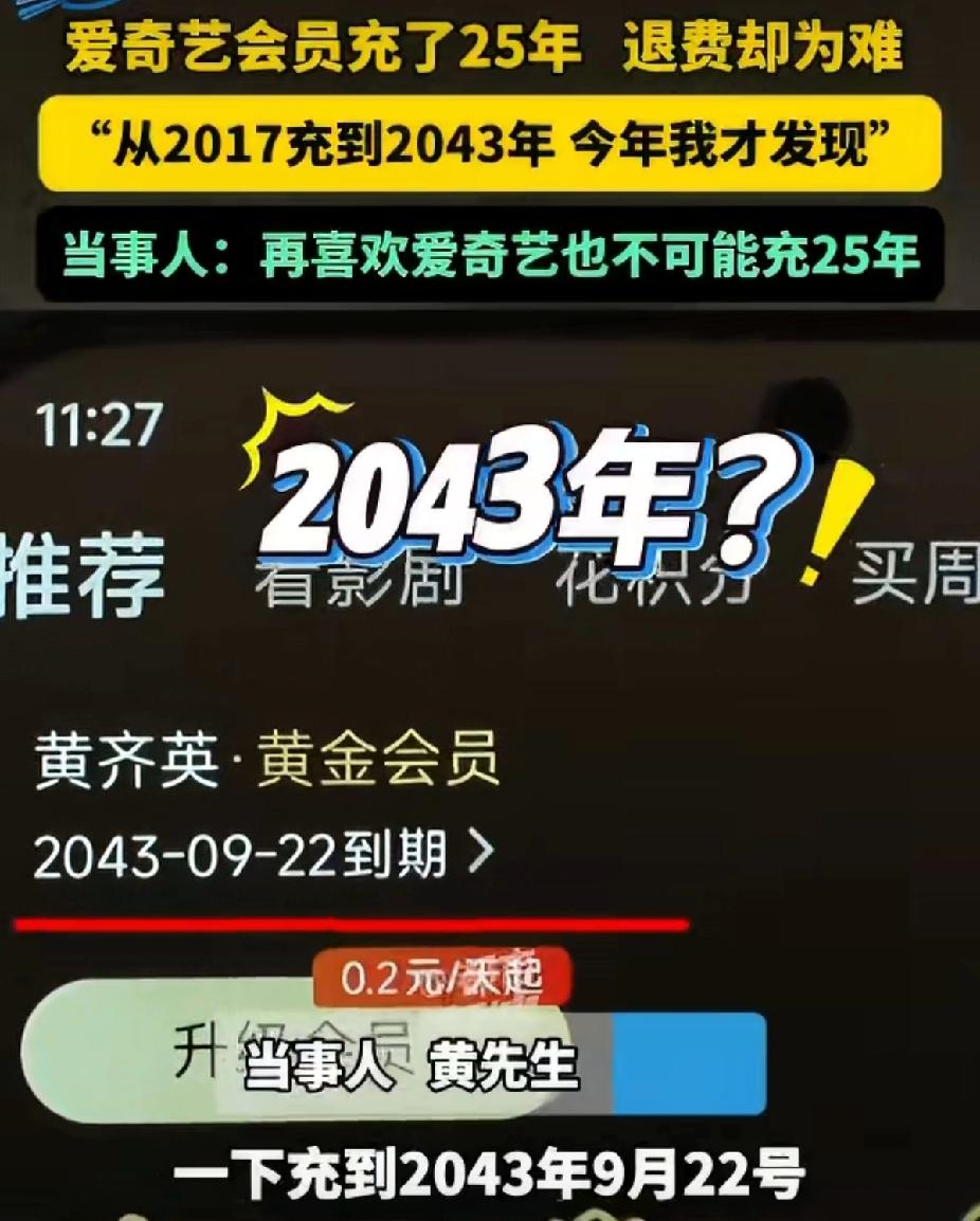 房贷30年会员25年!爱奇艺这波操作让网友笑喷:比婚姻还长久? 河南许昌黄先生的经历最近炸了锅!本来闲着想追个剧,点开爱奇艺一看直接懵圈——会员居然续到了2043年,足足25年!他吐槽:“再爱追剧也不至于充20多年啊,我房贷才还30年,这会员比房贷还坚挺!” 原来这会员是家人早年趁优惠充的,黄先生一直没留意,直到最近自己用才发现这份“跨世纪合约”。更闹心的是想退未消费的部分,客服说能原路退回,可当年充值的支付宝账号早就易主了,退回去等于白送别人,这操作让他直呼“推诿扯皮”。 网友们直接笑不活了:“这是要把会员当传家宝传给孩子啊”“建议爱奇艺给发个终身成就奖”“平台是不是该设个充值上限?不然手滑一下就绑定半辈子”。吐槽归吐槽,不少人都有过类似经历:自动续费藏在角落、默认勾选长期套餐、退款流程比追剧还曲折。 其实这事也给咱们提了个醒:充值会员时别瞎点“下一步”,自动续费记得关,长期套餐多琢磨琢磨。毕竟谁的钱都不是大风刮来的,总不能让“便利”变成“陷阱”吧? 你有没有过误充会员、自动续费被坑的经历?遇到退费难你会怎么处理?来评论区聊聊,也给身边人提个醒~ 会员退费难 自动续费陷阱 消费者权益保护