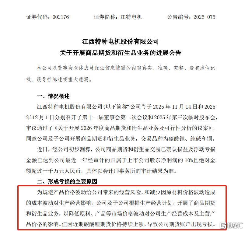 根据公告,江特电机于2025年11月14日、12月1日分别召开了董事会会议和临时股东会,审议通过了《关于开展2026年度商品期货和衍生品业务及可行性分析的议案》,同意公司及子公司开展商品期货和衍生品业务,交易品种为碳酸锂、纯碱和铜。