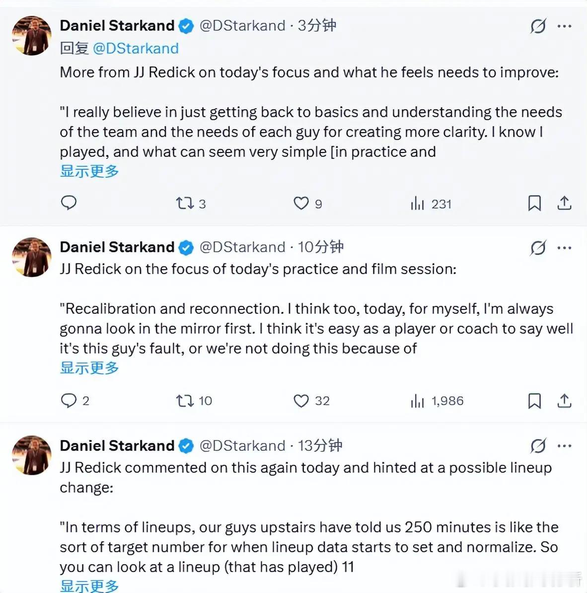 湖人再次开会!雷迪克决定变阵:詹姆斯回归后我们进攻端缺乏章法北京时间12月28日,湖人队今日再次召开球队会议,主帅雷迪克也在训练后接受了采访。此前,湖人队在年终大战遭遇了一场令人失望的失利。雷迪克把今天称为球队“重新调整和重新凝聚”的一天。谈及球队今日训练和录像分析课的重点时,雷迪克表示:“我们需要重新调整状态,重新建立团队联结。我觉得,今天对我个人而言,我始终会先从自身找问题。作为球员或教练,很容易脱口而出‘这是某某的错’,或者‘我们没做好是因为X、Y、Z这些原因’。今天早上我们教练组开了一个很成功的会议,我们很早就来到球馆,之后也和球员们进行了沟通。整个过程非常积极,核心在于倾听——我和教练组需要倾听球员的声音,了解他们的需求。”雷迪克还暗示球队会对阵容进行调整。“关于阵容安排,我们的数据部门告诉我们,250分钟左右是阵容数据趋于稳定和正常化的一个基准时长。所以,你不能只盯着一套只打了11分钟的阵容说‘哇,这11分钟打得真好!’。没错,我们确实在一场比赛中使用了小个阵容,而且那场比赛的效果不错,但我们不能仅凭这一点就下结论。不过,我们确实一直在关注一些阵容的表现趋势,并且已经就接下来的阵容调整方向做出了一些决定。”谈及球队今日训练重点以及他认为需要改进的地方时,雷迪克补充道:“我坚信我们要回归篮球本质,明确球队的需求以及每位球员的定位,让一切都更清晰。我深知,作为球员,训练和录像分析中看似简单的内容,一旦到了实战的高压环境中,就完全是另一回事了。这些问题不可能一天之内解决,但我们必须重新夯实防守基本功…… 这是我目前的首要任务。其次是明确球员角色。自从詹姆斯回归后,我们的进攻端缺乏章法,出现了太多混乱的回合。这责任在我。总而言之,就是三件事:防守思路清晰、角色定位明确、进攻组织有序。”此前有数据表明,湖人的常规首发(詹姆斯、东契奇、里夫斯、八村垒、艾顿)的多项数据在队内阵容中排名垫底,效果很糟糕。随着里夫斯将缺阵未来一个月,雷迪克也得调整阵容,他接下来会摆出怎样的首发来应对比赛,让我们拭目以待。
