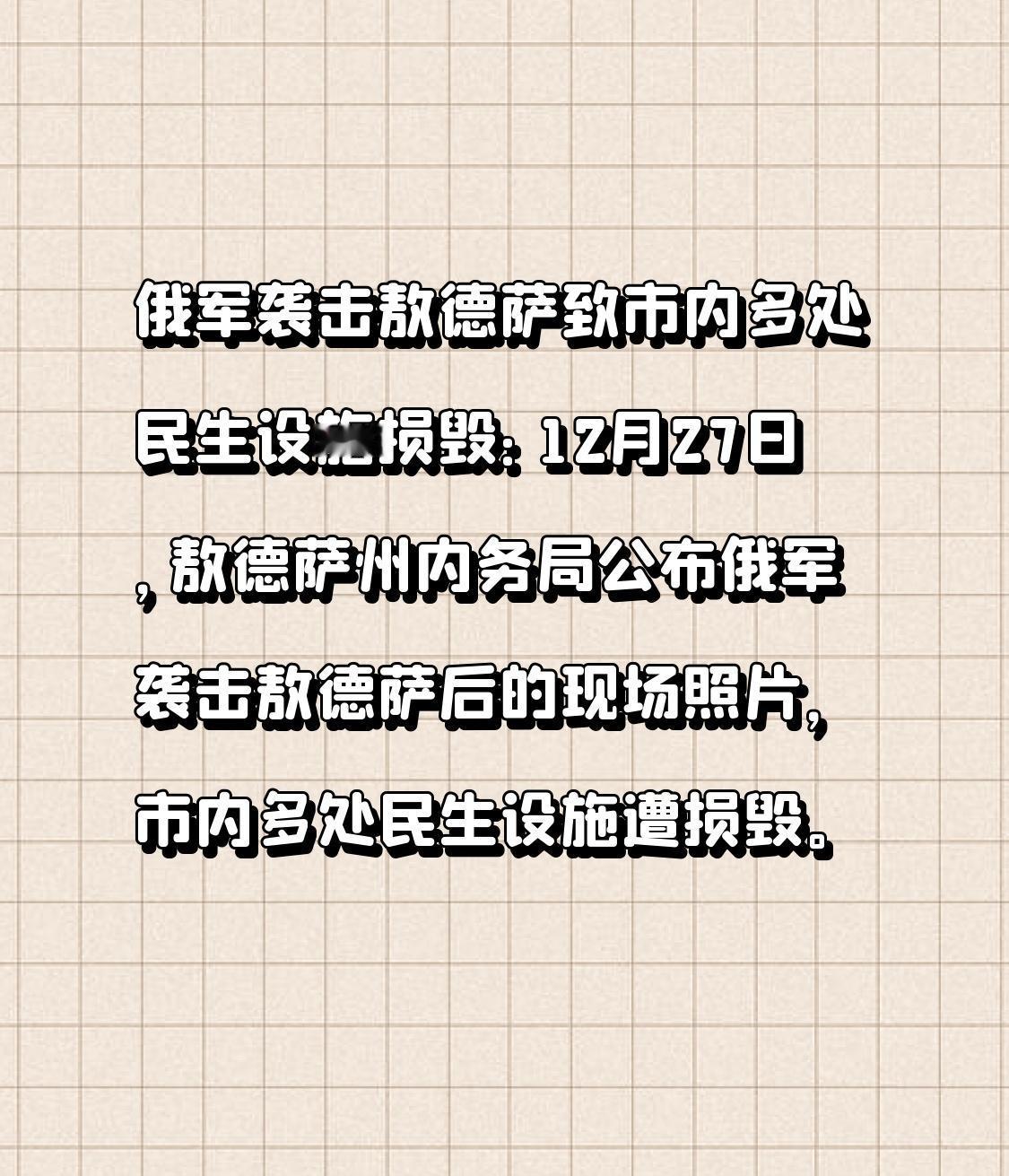 俄军袭击敖德萨致市内多处民生设施损毁:12月27日,敖德萨州内务局公布俄军袭击敖德萨后的现场照片,市内多处民生设施遭损毁。