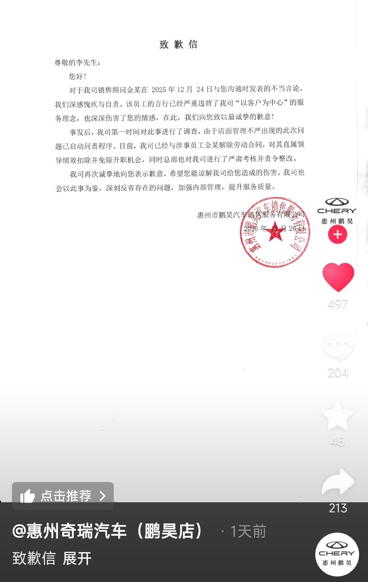 奇瑞汽车惠州鹏昊店发声明道歉:已与涉事员工解除劳动合同,总部也对我司进行了严肃考核并责令整改!确实也应该如此,毕竟销售行业就是服务行业,一个顾客应该不在你店里买东西就发出恶意诅咒,是非常不妥,并且员工个人素质也非常差的!但是,奇瑞汽车惠州鹏昊店有错就认,知错就改,挨打要立正,敢作敢当,也是一件好事。但是,网上某些网友却不乐意了,他们强调该客户去买雅阁了,是日系车,所以挨骂是活该!这其实也是很没素质的表现,现在是经济全球化,很多国际上很多商品都是相互融合的,这样彼此的企业才能走向世界,有更好的发展。而有如此想法的网友就是自我封锁,自缚手脚,不利于中国品牌国际化发展!