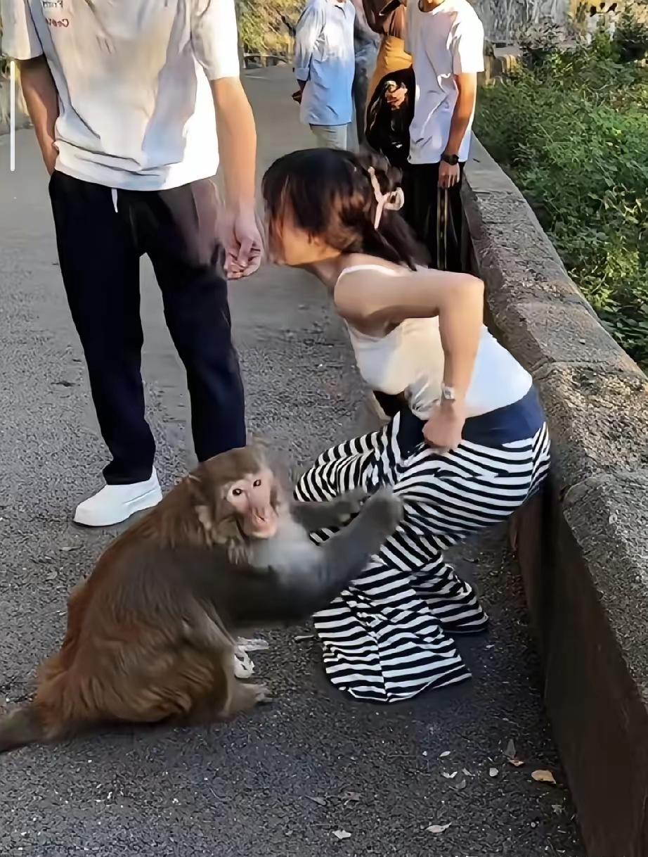 大家说这只猴子是不是成精了,居然在大庭广众之下还敢去扯人家女生的裤子,难道他是一个法盲吗?我想如果是男人这样做的话,这个是可以判刑的! 我们经常看到游客在山里的景区游玩,往往会碰到一些猴哥的骚扰,特别是女生最容易被欺负。有的猴子会去抢人家手上吃的零食,还有的会去偷人家的包包,更有甚者甚至去扯人家女生的衣服,碰到这种情况我们该怎么办? 猴子虽然属于动物,但他们非常顽皮,特别是仗着人多势众往往会去主动骚扰游客,一不小心就会吃他们的亏。关键是猴子还属于景区的保护动物,打不得骂不得,他动了你也不违法只能干着急,谁叫人家是动物呢?我们在进入有野猴的景区的时候,一定时刻提防他们,要学会保护自己,特别是不要去惹他们,因为他们真的惹不起。丢点东西还是小事,有时候被他们锋利的爪子抓伤了那可是大事,旅个游还要去打破伤风这真的够喝一壶了!当然了,也希望景区的管理部门有时候也对猴子适当的教训一番,把他们的猴性约束一下,猴子也是通人性的,适当教育一下他们也懂的,你们说呢?