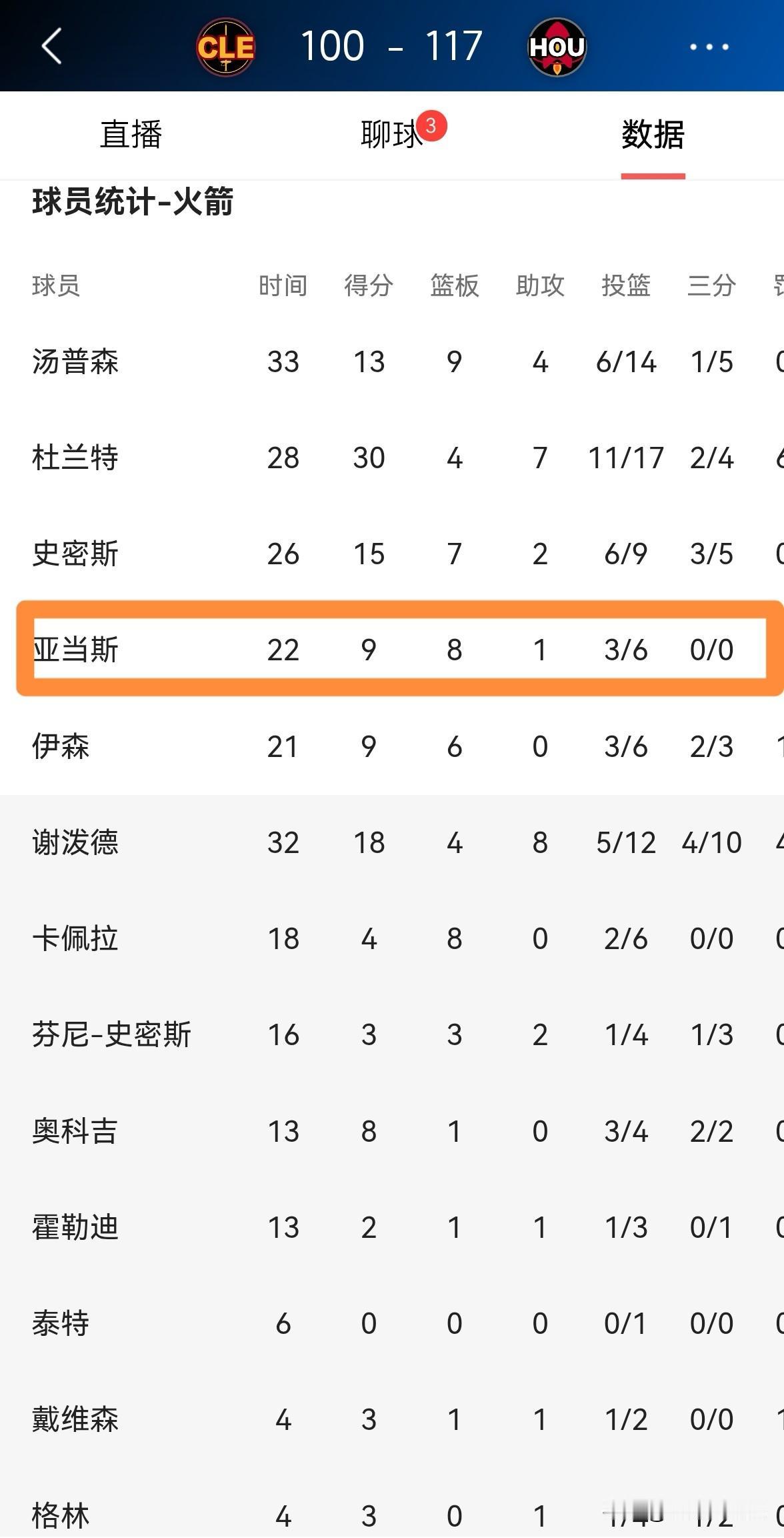我实在忍不住要怒赞火箭老将亚当斯了!今天火箭在主场以117:100大胜骑士,此役首发出战的亚当斯登场22分钟,投篮6中3,其中罚球6中3得到9分8篮板2抢断,他的场上正负值为全队最高的+26。 尽管本场比赛亚当斯的数据并不亮眼,但是他在攻防两端都为球队提供了非常大的帮助,我觉得亚当斯是火箭能够早早的确立大比分领先优势的关键。