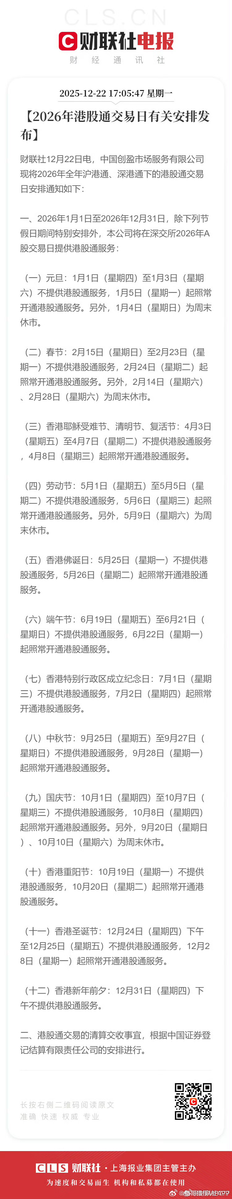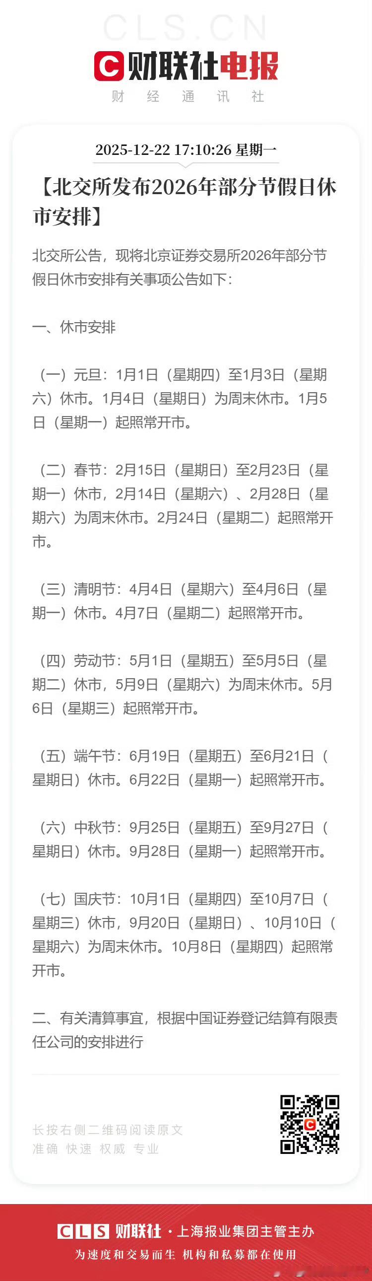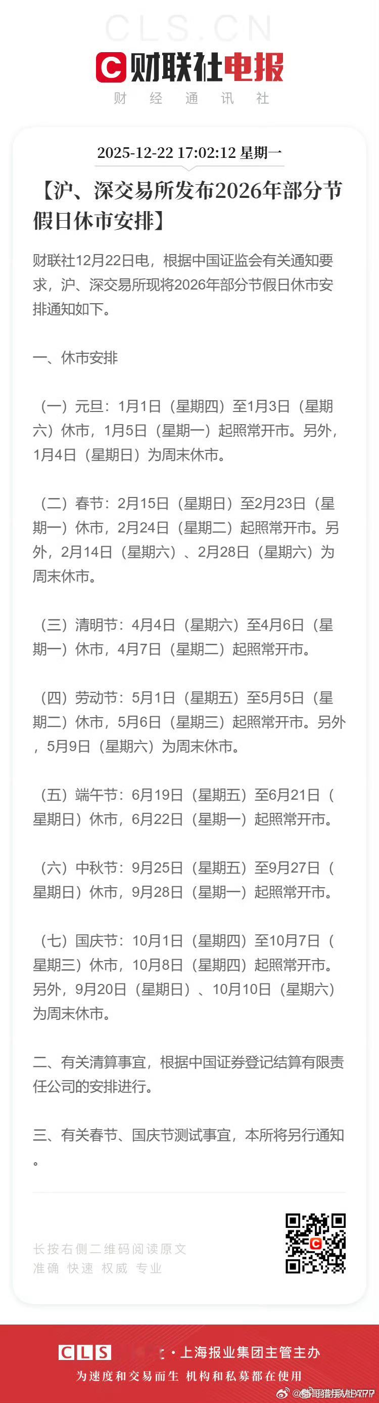 2026年节假日休市安排【沪、深交易所发布2026年部分节假日休市安排】财联社12月22日电,根据中国证监会有关通知要求,沪、深交易所现将2026年部分节假日休市安排通知如下。一、休市安排(一)元旦:1月1日(星期四)至1月3日(星期六)休市,1月5日(星期一)起照常开市。另外,1月4日(星期日)为周末休市。(二)春节:2月15日(星期日)至2月23日(星期一)休市,2月24日(星期二)起照常开市。另外,2月14日(星期六)、2月28日(星期六)为周末休市。(三)清明节:4月4日(星期六)至4月6日(星期一)休市,4月7日(星期二)起照常开市。(四)劳动节:5月1日(星期五)至5月5日(星期二)休市,5月6日(星期三)起照常开市。另外,5月9日(星期六)为周末休市。(五)端午节:6月19日(星期五)至6月21日(星期日)休市,6月22日(星期一)起照常开市。(六)中秋节:9月25日(星期五)至9月27日(星期日)休市,9月28日(星期一)起照常开市。(七)国庆节:10月1日(星期四)至10月7日(星期三)休市,10月8日(星期四)起照常开市。另外,9月20日(星期日)、10月10日(星期六)为周末休市。二、有关清算事宜,根据中国证券登记结算有限责任公司的安排进行。三、有关春节、国庆节测试事宜,本所将另行通知。