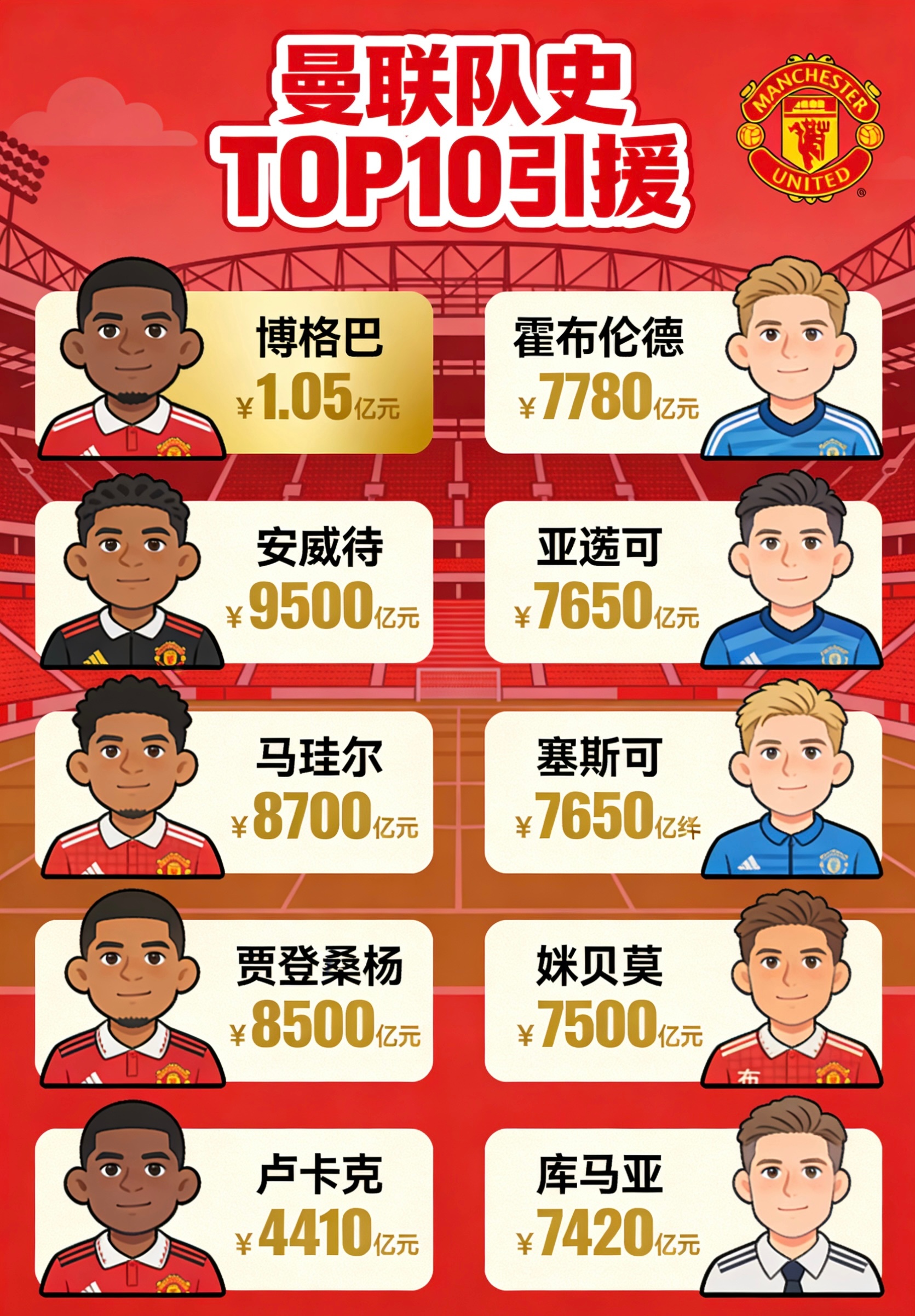 【曼联队史最昂贵的十笔引援】1. 保罗·博格巴 - 1.05亿(尤文,2016)| 队史标王,两度效力,2022自由离队2. 安东尼 - 9500万(阿贾克斯,2022)| 边锋,近年租借在外,表现未达预期3. 哈里·马奎尔 - 8700万(莱斯特城,2019)| 前队长,主力位置与状态下滑4. 贾登·桑乔 - 8500万(多特蒙德,2021)| 边锋,曾被下放青训,长期状态低迷5. 罗梅卢·卢卡库 - 8470万(埃弗顿,2017)| 两度加盟,2019高价转投国米6. 拉斯穆斯·霍伊伦德 - 7780万(亚特兰大,2023)| 中锋,2025-26赛季逐渐扛起锋线7. 本杰明·塞斯科 - 7650万(莱比锡,2025)| 2025夏窗签约,前锋,尚处适应期8. 布赖恩·姆贝莫 - 7500万(布伦特福德,2025)| 2025夏窗边锋引援9. 安赫尔·迪马利亚 - 7500万(皇马,2014)| 仅效力1赛季,高价转投巴黎10.马特乌斯·库尼亚 - 7420万(狼队,2025)| 2025夏窗签约,前锋/边锋
