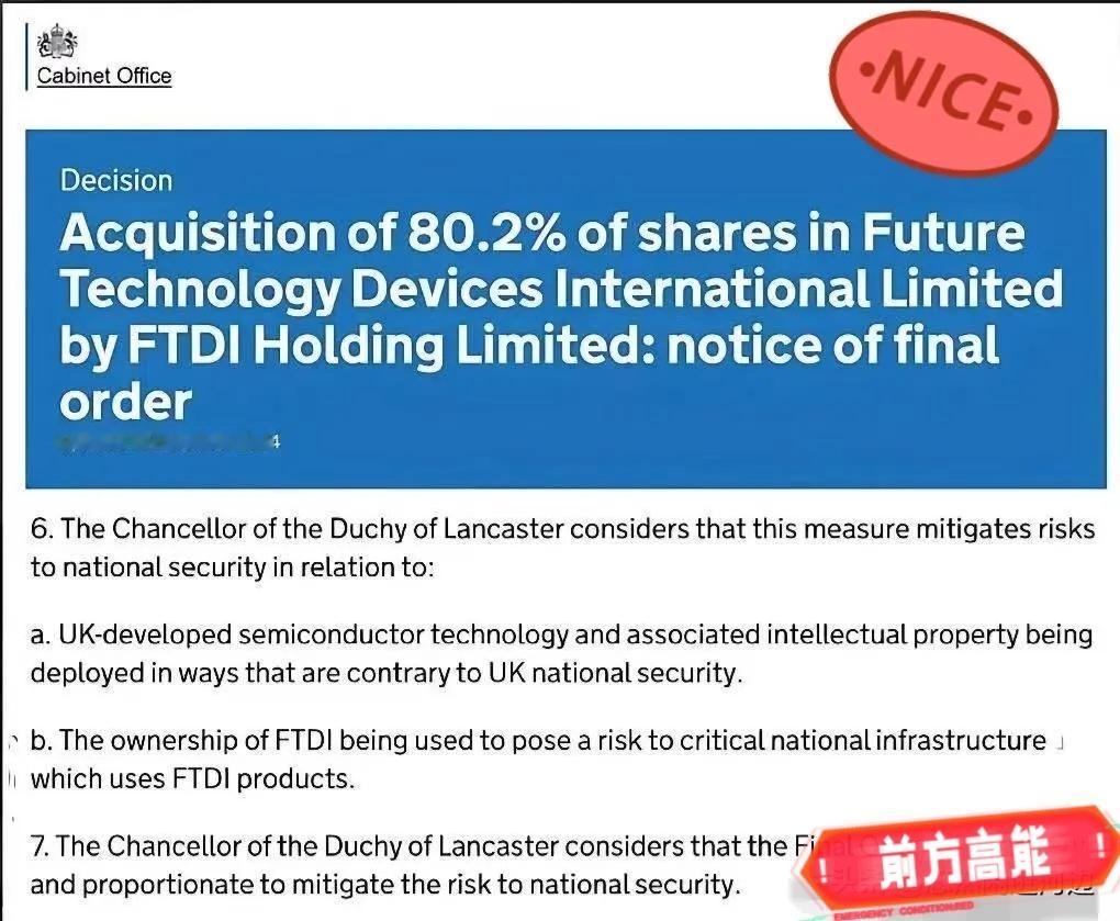 英国又出手了!继荷兰抢夺中资持有的安世半导体之后,伦敦也以“国家安全”为名,逼迫中国建广资产交出其在FTDI公司80.2%的股权。 这起事件并非孤立的商业纠纷,而是当前全球科技领域地缘博弈的典型切片。2021年12月建广资产以4.14亿美元完成收购时,交易完全符合当时的英国法律与市场规则。 FTDI作为1992年成立的无晶圆厂设计公司,核心产品USB桥接芯片市占率近20%,应用于工业控制、医疗设备等领域,其技术价值在于产业链配套而非尖端涉密。 英国政府的干预依据是2022年生效的《国家安全与投资法》,却援引“追溯审查”条款倒查此前交易,这种法律适用逻辑已突破常规营商环境的可预期性。 从程序上看,英国政府2024年11月发布强制出售令后,建广资产的司法复核与临时救济申请,均在2025年被高等法院驳回,法律途径未能改变结果。 官方声称的“技术外流风险”缺乏实质证据支撑,FTDI 2024年英国本土销售额仅363万美元,对当地关键基础设施的影响力有限,且同类技术在全球并非独家。 此类操作与荷兰安世半导体案形成呼应,本质是将“国家安全”泛化,把正常的跨国并购纳入地缘政治对抗框架,违背了市场化与契约精神的基本准则。 对全球投资者而言,这种“秋后算账”式的审查模式,摧毁了英国营商环境的核心优势——规则稳定性,可能导致资本对欧洲高科技领域投资趋于谨慎。 从产业影响看,半导体产业链的全球化分工基础正在被政治力量侵蚀,强行剥离股权可能引发供应链波动,本田部分工厂因安世供应问题停产已敲响警钟。 对中国半导体产业而言,这再次印证核心技术难以通过海外并购长期掌控,南京沁恒微等企业的国产替代进展,已证明自主研发才是突破封锁的关键路径。 国际投资的本质是信任与共赢,当法律沦为地缘博弈工具,最终受损的将是实施方自身的市场吸引力与全球产业话语权。 各位读者你们怎么看?