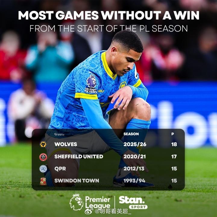 英超历史最差开局!狼队开季18轮不胜,创造了英超历史的最差开局,超越谢菲联在2020/21赛季的17轮不胜。