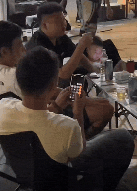 别人在喝酒聊天,唯独一名男子捧着手机,手指在计算器上胡乱按一堆数字,时不时还对着