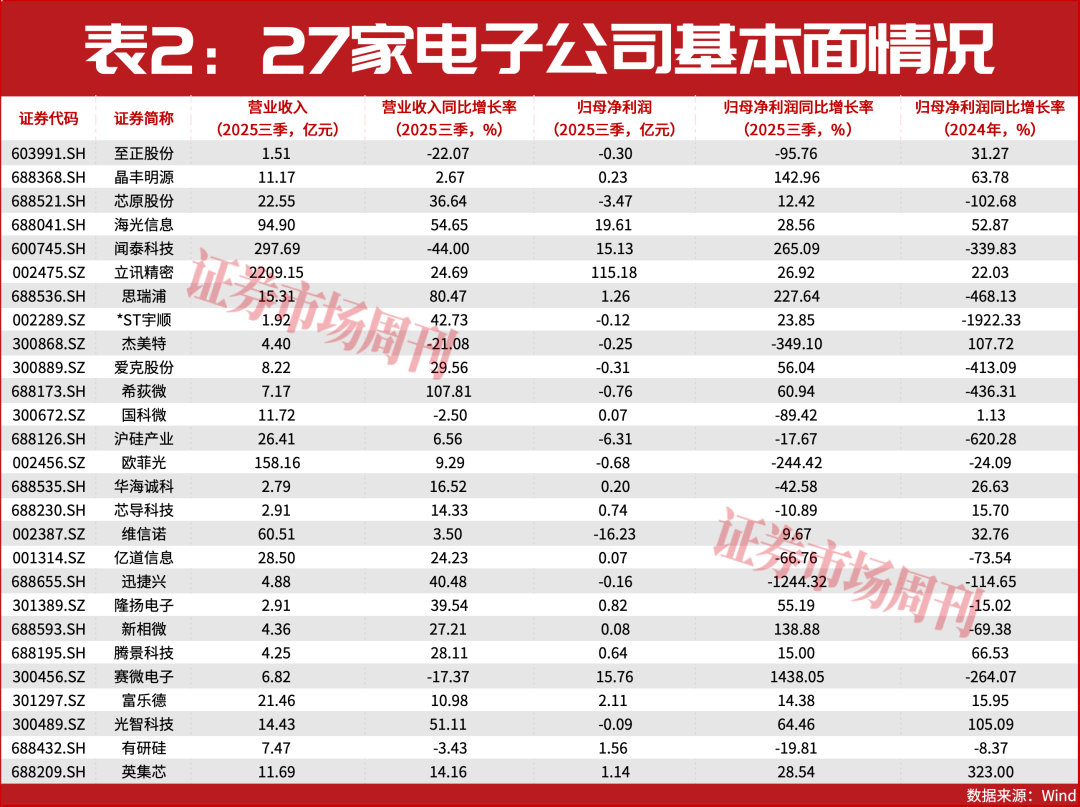 从发起并购重组公司基本面来看,既有白马龙头也有亏损公司。据Wind统计,在今年以来发布并购重组事件公告的27家电子公司中,2025年前三季度保持盈利的公司16家,亏损公司11家;2025年前三季度业绩保持同比增长的公司有17家,盈利出现下降的公司有10家(见表2)。