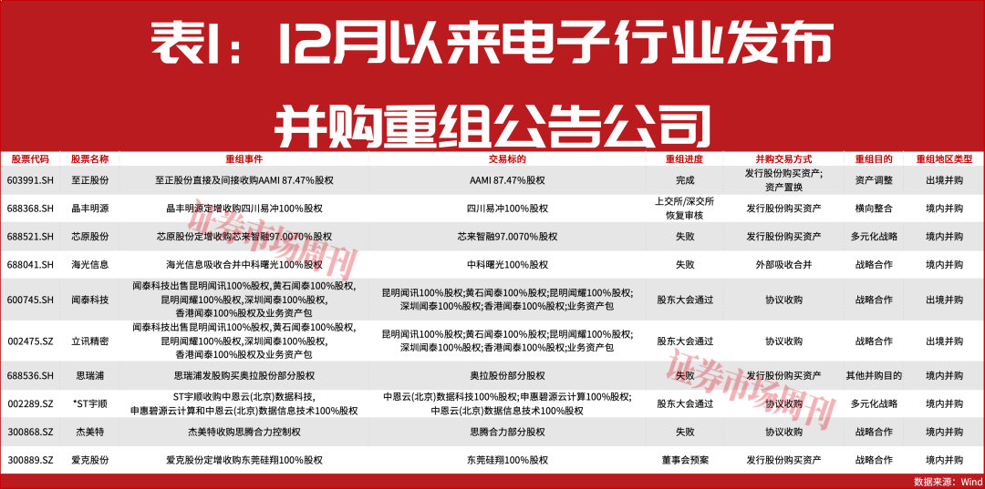 以12月以来发布并购重组公告的电子公司为例,重组完成的公司为1家,重组失败的为4家,股东大会通过的为3家,其余两家分别处于“上交所/深交所恢复审核”或“董事会预案”的阶段。从重组目的来看,涵盖资产调整、横向整合、多元化战略、战略合作、其他并购目的;重组地区类型涵盖出境并购和境内并购(见表1)。