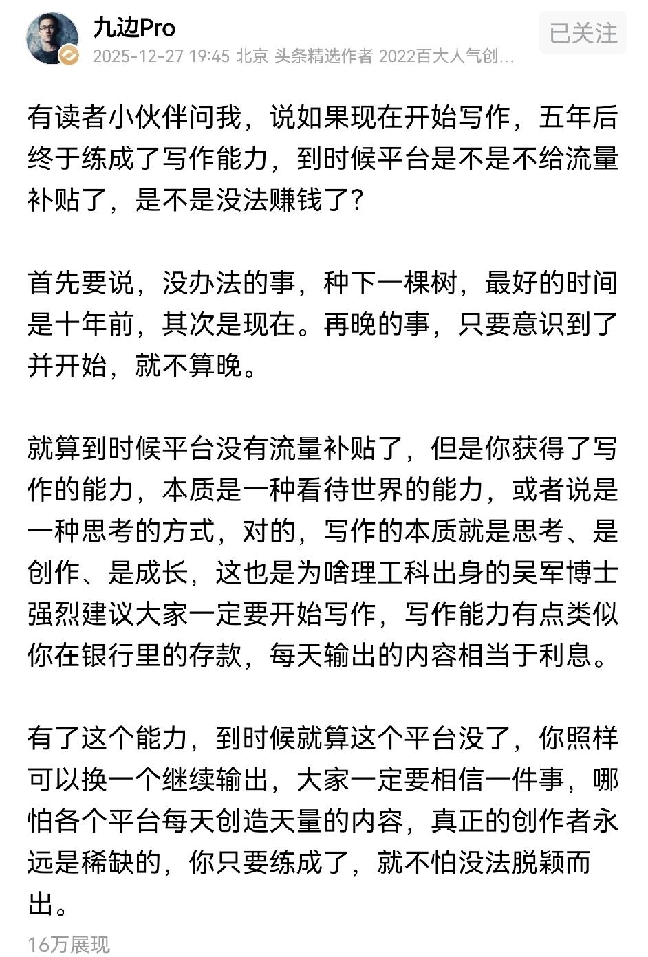 九边说一个人的写作的能力,其实是他看待世界的能力,一种思考的方式。这话不假,写作不仅仅是写出文字,它还需要思考,需要提炼,需要梳理,最后才是以文字的形式输出成文章。 总有这样的观点,写的好的人都是行动力差的人,或者说行动力高效的人,不需要写作能力,以至于许多人并不在意写作能力的培养和塑造。作为中年老登,越来感受到,写作不仅仅是文笔的问题,还是你思维方式,逻辑能力,以及人生阅历和文字功底的体现,而且行动力和写作能力并不是相冲突的关系,而是相促进的关系。