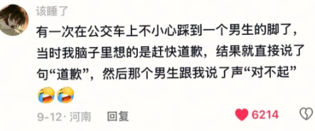 有一次在公交车上不小心踩到一个男生的脚了,当时我脑子里想的是赶快道歉,结果就直接说了句"道歉",然后那个男生跟我说了声"对不起"