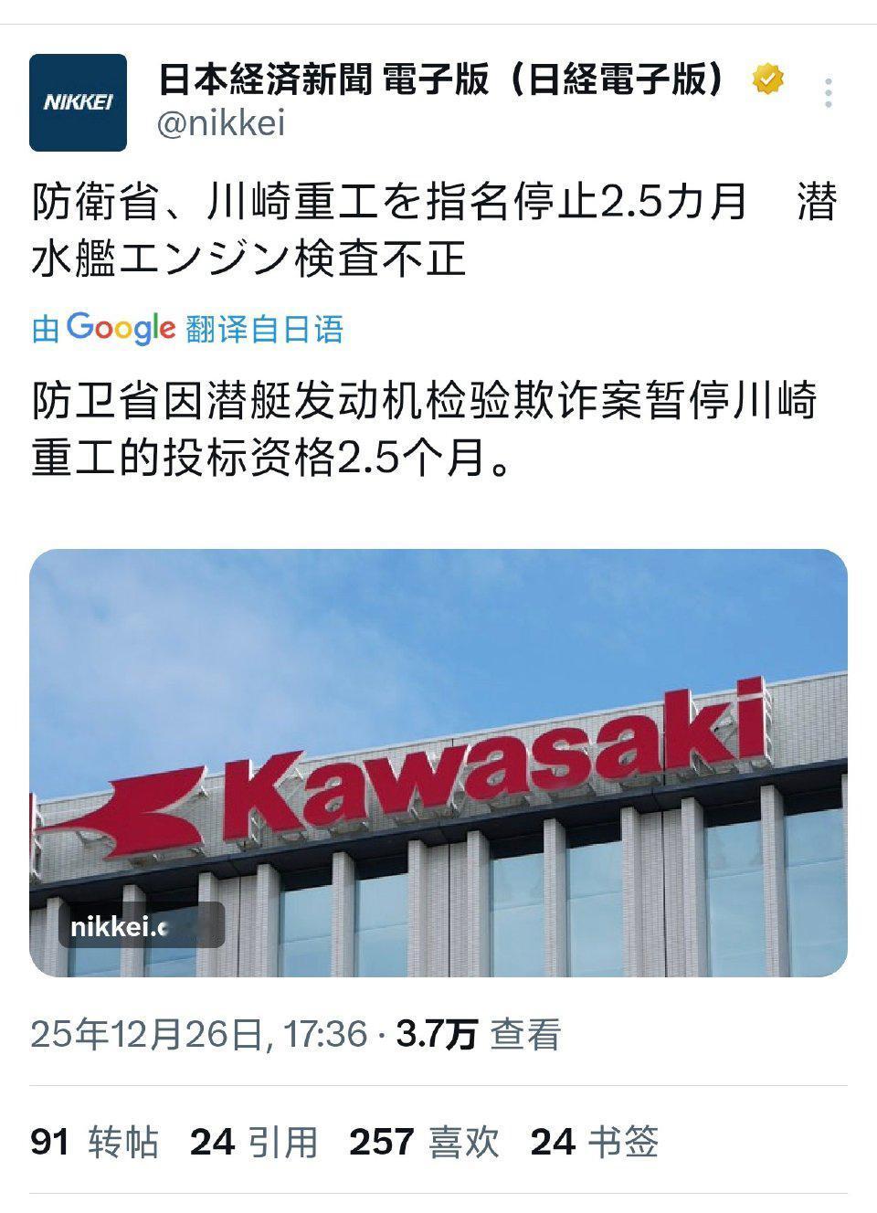 日本一家主要的军工企业,被曝出造假,而且一造就是三十多年。 这家公司是川崎重工。他们最近承认,从1988年开始,一直到2021年,他们在为日本海上自卫队制造潜艇柴油发动机时,长期篡改燃油效率和输出功率这些关键数据。一共涉及66台发动机,覆盖了现役的全部25艘潜艇。他们改了检测设备,伪造记录,就为了让数据“看起来”达标。 这事是去年8月一起民用船舶发动机造假案的延续。当时他们承认了673台船用发动机有问题,结果顺藤摸瓜,查到了军用领域。 处罚决定出来了,日本防卫省给的处理是:停止川崎重工参与招标两个半月。这个处罚被很多人批评太轻了,简直是“隔靴搔痒”。因为停标期正好赶上招标淡季,实际影响不大。更让人无语的是,这家公司2013年就因为竞标舞弊被罚过,当时也只是停了两个月。 调查还牵出了别的问题。他们通过虚假交易搞了个“小金库”,然后用里面的钱给海上自卫队的相关人员送礼物,像游戏机、高尔夫球具、名表什么的。虽然涉事的船员被处分了,但公司高层却没人被追究刑责。 为什么罚这么轻?一个可能的原因是,日本潜艇的发动机供应被川崎重工独家垄断,防卫省没有别的选择,罚重了可能让自己也难堪。 但这引发了严重的安全担忧。防卫省嘴上说造假“不影响安全性能”,但专家指出,油耗数据是假的,实战中就可能算错续航力,增加潜艇上浮充电暴露的风险。性能参数失真,还可能影响与美国联合军事行动的配合。 这件事只是日本制造业连环造假的最新一例。之前还有神户制钢、三菱电机、丰田等多家车企的数据造假丑闻。为了保住订单,一些企业不惜长期系统性造假,而监管却形同虚设。所谓的“工匠精神”,在一些领域已经变成了“鞠躬道歉”的套路。 当造假渗透到关系到国家安全的军工领域,并且持续三十多年都没被发现,这暴露的问题就不仅仅是产品质量了,而是整个体系的监管失灵和政商关系的深层痼疾。冬日生活打卡季