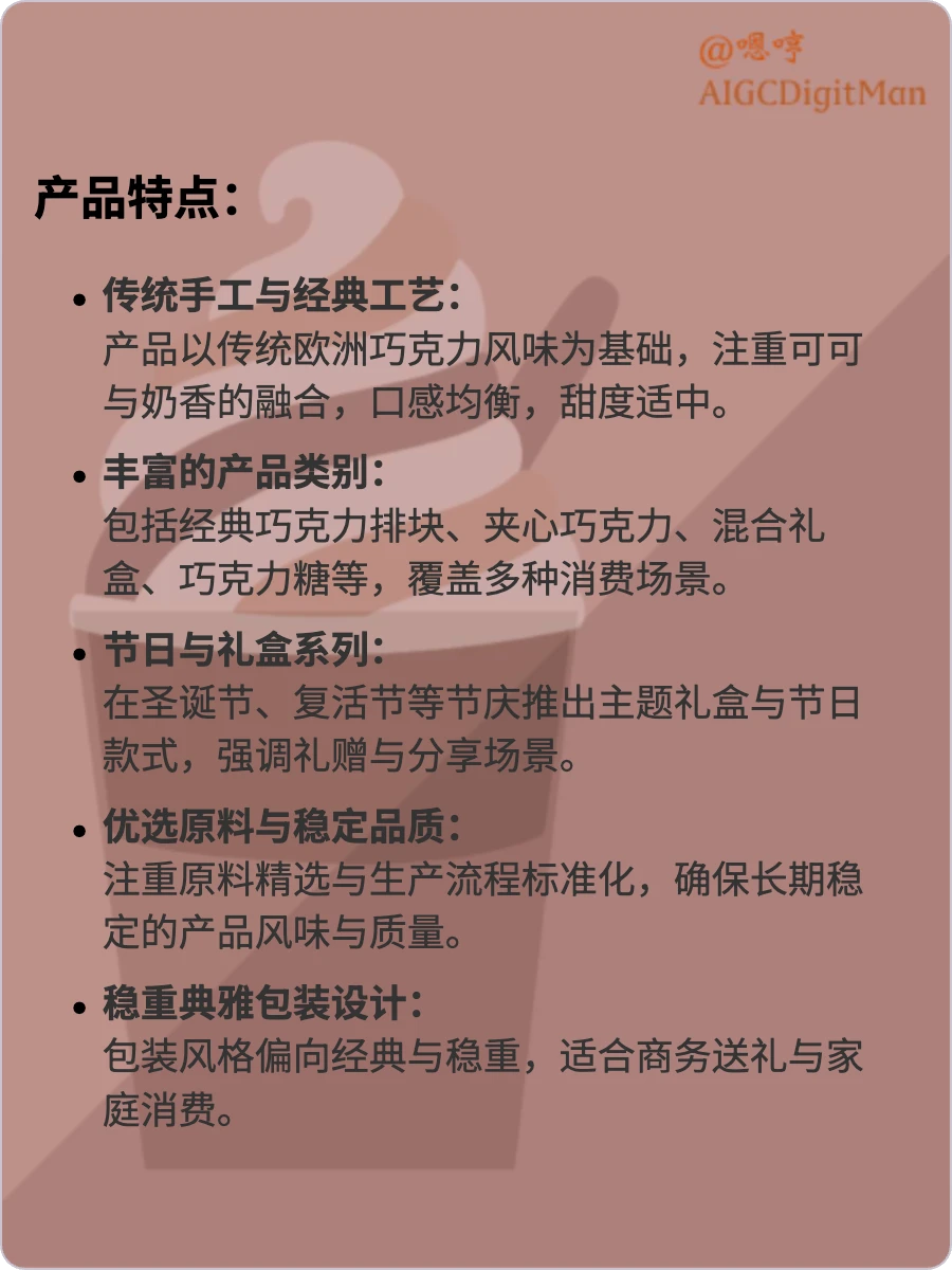 传统手工与经典工艺: 产品以传统欧洲巧克力风味为基础,注重可可与奶香的融合,口感均衡,甜度适中。