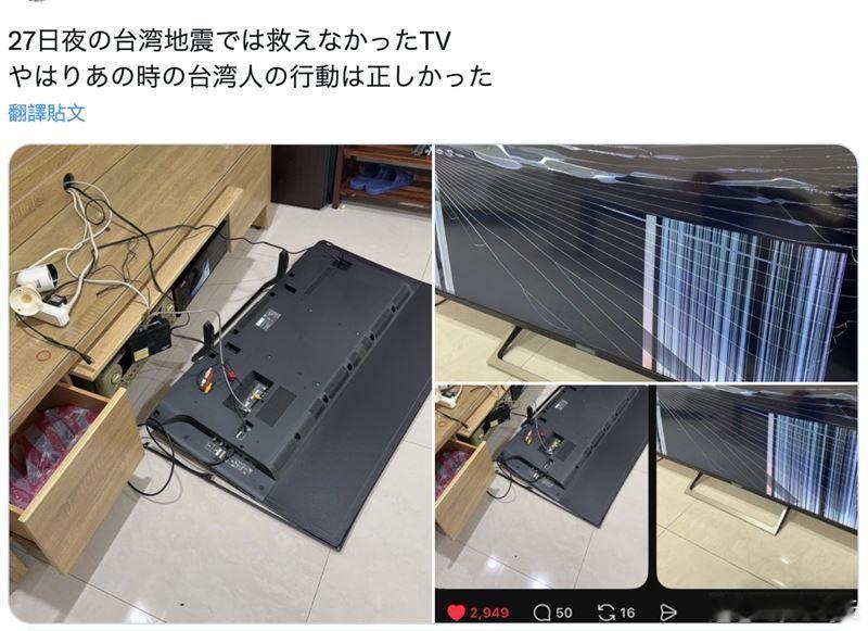 日本地震时台湾人保护日本电视,台湾地震时电视摔坏,获得日本人赞赏三立新闻报道,日本12月8日晚间发生规模7.5强震,有台湾旅客第一时间是先出手扶着旅馆房间的液晶电视,被日本网友大赞。这次台湾地震,有台湾网友附上电视摔坏的照片,被日本网友转发至X平台表示,「27日晚间台湾大地震中未能抢救回来的电视机,果然当时台湾人的做法是正确的。」笑称台湾人强震时保护日本电视的行为是正确的。三立称该行为在X平台掀起热议,纷纷表示,「非常感谢台湾人民的体贴和善意」、「保护电视机的行为令人钦佩。这种善举展现的是人自身的同情心」、「比日本人还冷静的反应,吓到我了!应该先保护自己的生命,竟然还去护电视」。台湾海域6.6级地震台湾游客在东北被抢着买单