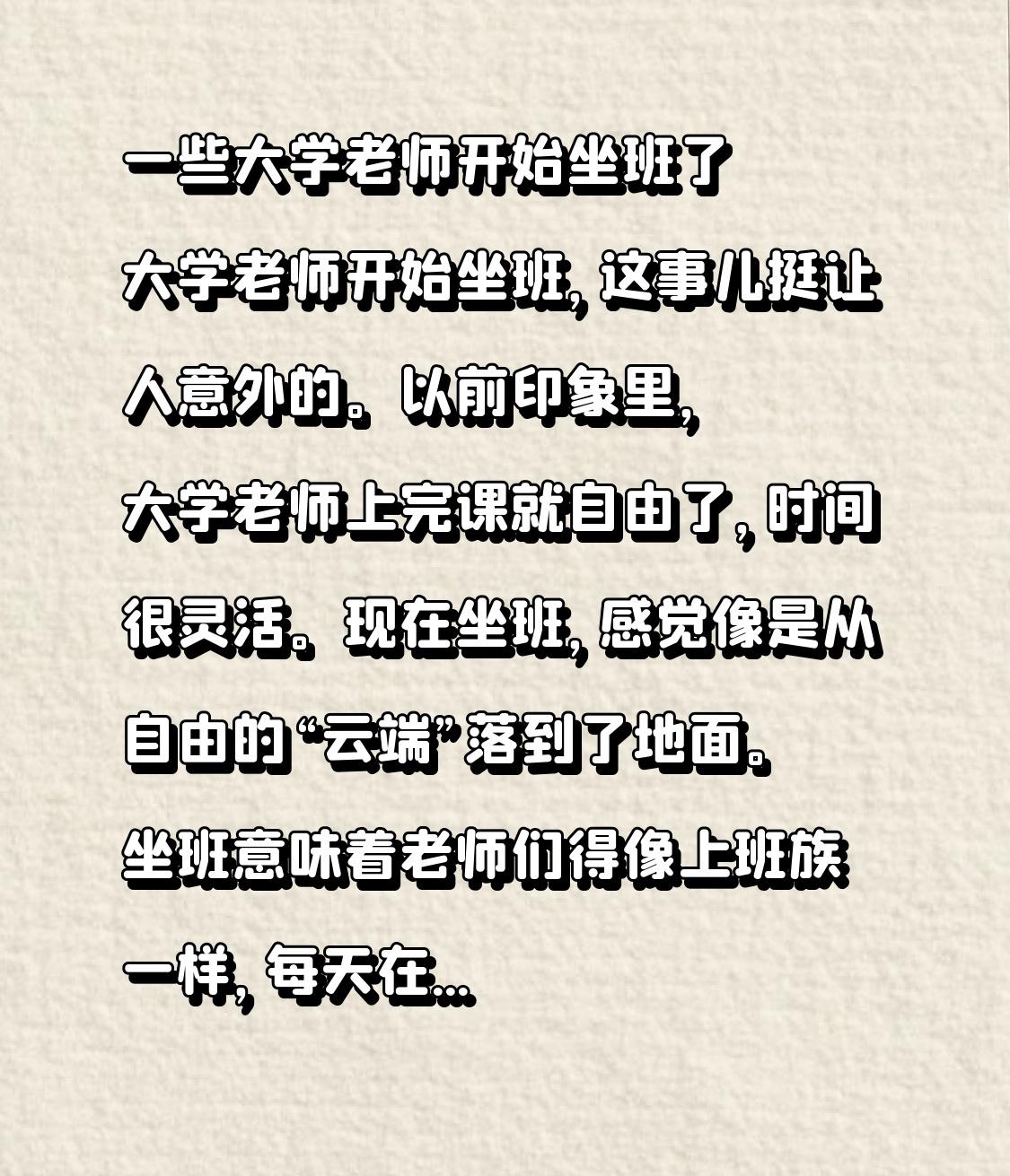 一些大学老师开始坐班了 大学老师开始坐班,这事儿挺让人意外的。以前印象里,大学老师上完课就自由了,时间很灵活。现在坐班,感觉像是从自由的“云端”落到了地面。 坐班意味着老师们得像上班族一样,每天在固定时间到岗。这或许能让学校更好地管理老师,也方便学生随时找到老师。但从老师角度看,可能会限制他们的自由安排,比如做学术研究、参加学术交流活动的时间会受影响。就像有老师说,以前可以趁灵感来了通宵写论文,现在坐班时间固定,灵感来了也得先忍着。不知道这对教学质量和学术研究是好是坏,只能观望了。
