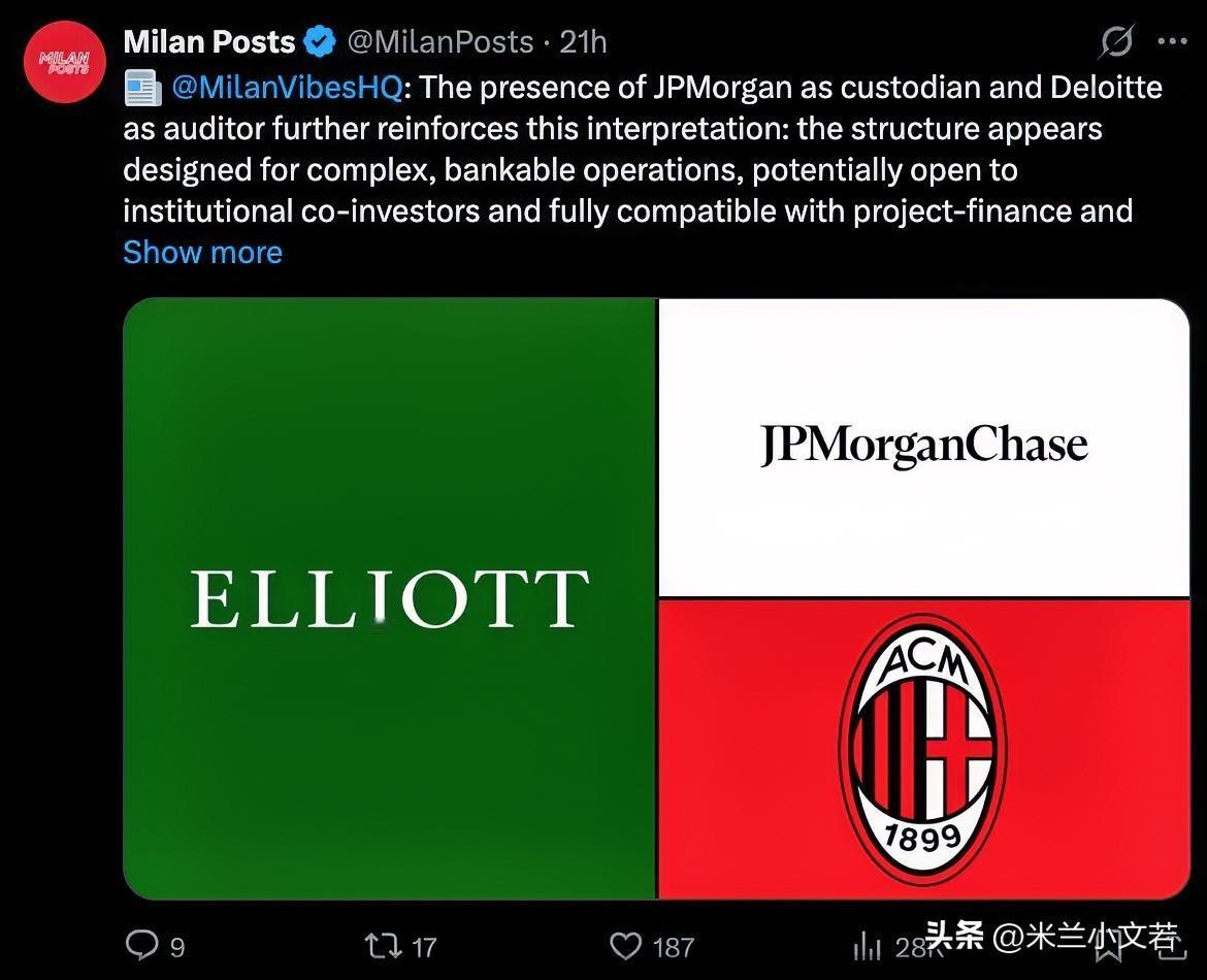 摩根大通!红鸟集团在没有找到新的受害者时候想到了一种新的金融交换模式,大概意思是说米兰通过贷款转变抵押和担保方向,高炮将成为球场的债权方,红鸟以俱乐部担保成为球场的债务人,高炮从俱乐部管理层和持有人角色撤出,避免了经营风险,只但持有球场的贷款收益,红鸟不再受高炮掣肘全面掌握俱乐部。 但是这个方案被米兰另一位潜在债主摩根大通给否了,我记得红鸟融资,借了埃利奥特6亿,去年这个时候偿还了不到两亿,同时借了摩根财团3亿,去年这个时候貌似没看到偿还摩根大通利息的消息,不知道之前是如何约定的,很可能摩根准备摘桃子。 据说小摩根盯米兰这个项目三四年了,初期给红鸟出资就是为了球场,这时候怎么可能会同意让高炮插手,高炮在红鸟面前是老大,但在小摩根面前啥也不是,摩根大通无论从金融层面还是政治层面都不是埃利奥特能比拟的,所以现在米兰有点微妙了,摩根财团如果有涉足体育的想法,这对米兰而言那绝对是一件好事情。
