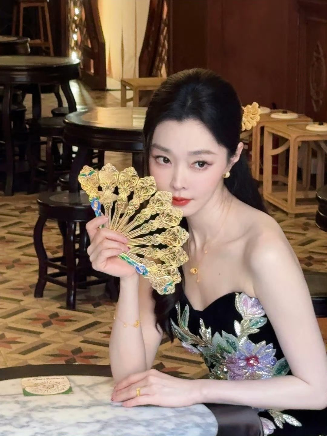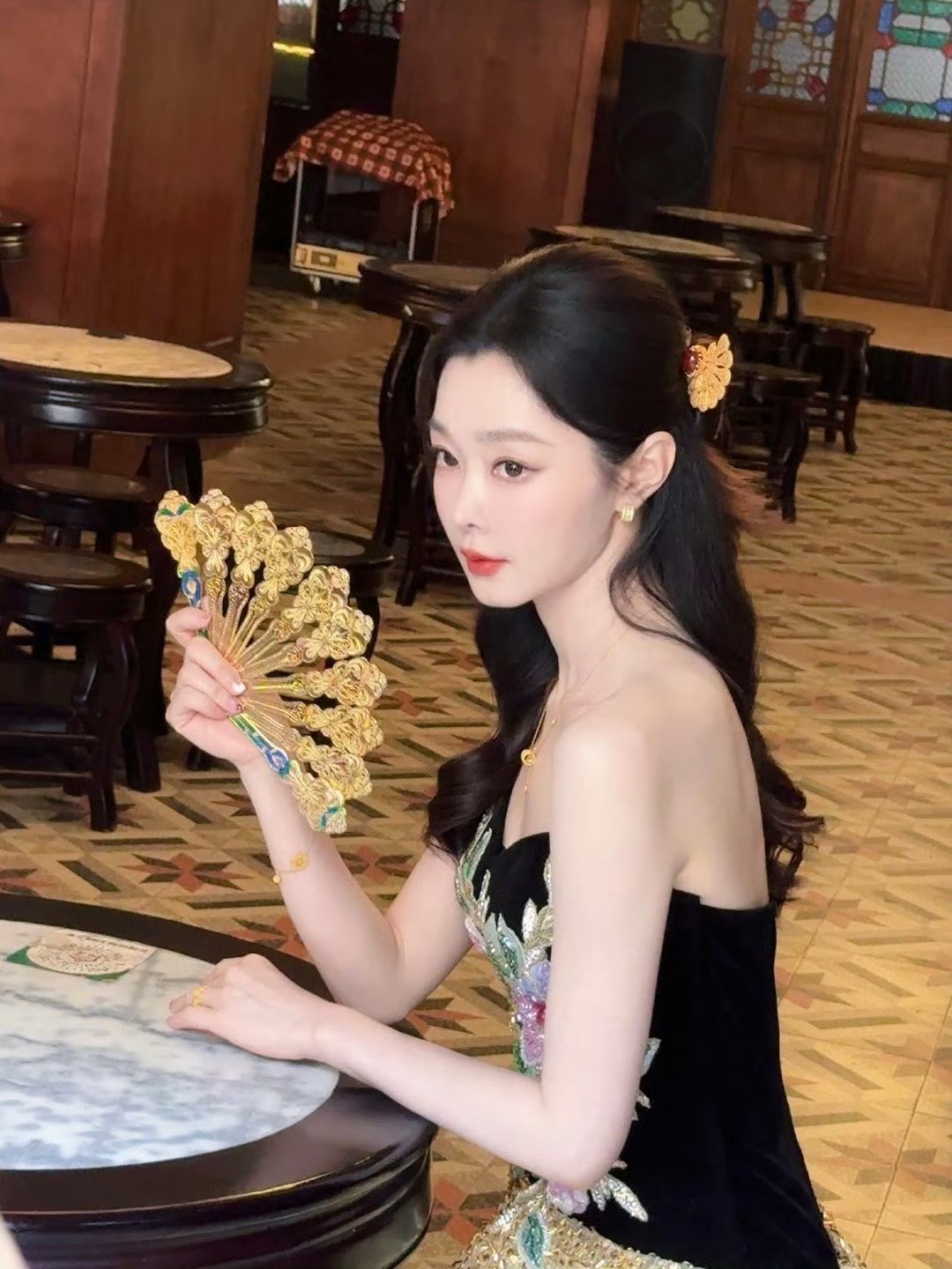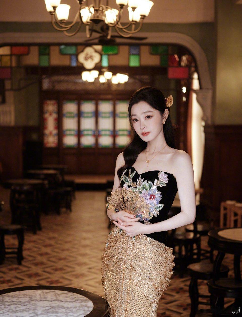 宋轶新中式美成啥样了 宋轶这身造型美得既有质感又有格调。黑底金线刺绣裙彰显高级,镂空金扇添古典韵味,妥妥的国泰民安脸,东方美学代言人