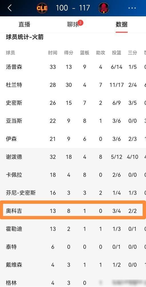火箭大将奥科吉真是太想证明自己了!在今天火箭主场以117:100轻取骑士的比赛中,奥科吉在球队胜局已定的情况下获得了13分钟的上场时间。 虽然那会儿比赛基本已经没悬念了,但这哥们儿一上来就跟打总决赛似的,浑身散发着一种“别把我当路人”的狠劲。 我特意留意了他的表现,这13分钟简直是高效的代名词,一共出手4次就进了3个。 尤其是那两记三分球,投得是真硬气,这种百分之百的中准率瞬间就把全场气氛给带起来了。 最后他交出了8分1篮板的数据,说实话,对于一个末节才上来热身的球员来说,这效率确实有点夸张。 其实我更在意的是他的这种求生欲,在乌度卡手下打球,如果没有这种时刻准备着撕咬对手的精气神,是真的很难熬出头的。 感觉他这几记进球不只是为了刷分,更像是憋着一股劲给教练组看,明摆着是在争夺那个宝贵的轮换席位。 很多人觉得这种时间是垃圾时间,但对奥科吉这种球员来说,每一秒都是他留在场上的救命稻草。 估计这场打完乌度卡心里也得重新盘算了,这种只要给点阳光就灿烂的板凳悍将,后面是不是该考虑多给点机会?