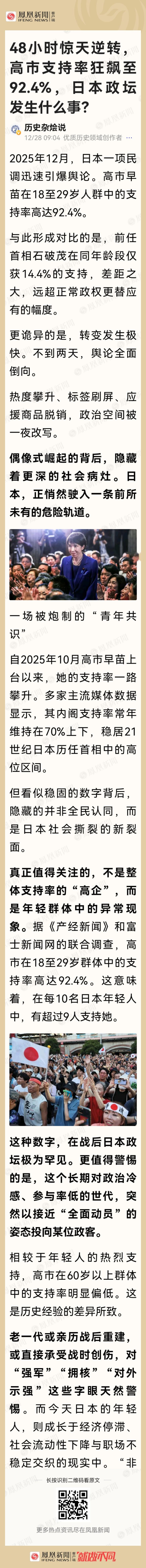 高市早苗正在煽动日本人的军国主义与纳粹主义复苏,恰似二战前日本人和德国人对战争的那种狂热。其主要针对的目标正是中国。中国人应当提高警惕了,当今世界并不太平,战争贩子正在策动仇恨与对抗!
