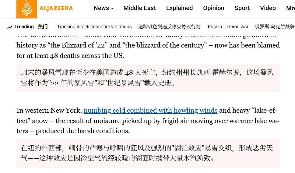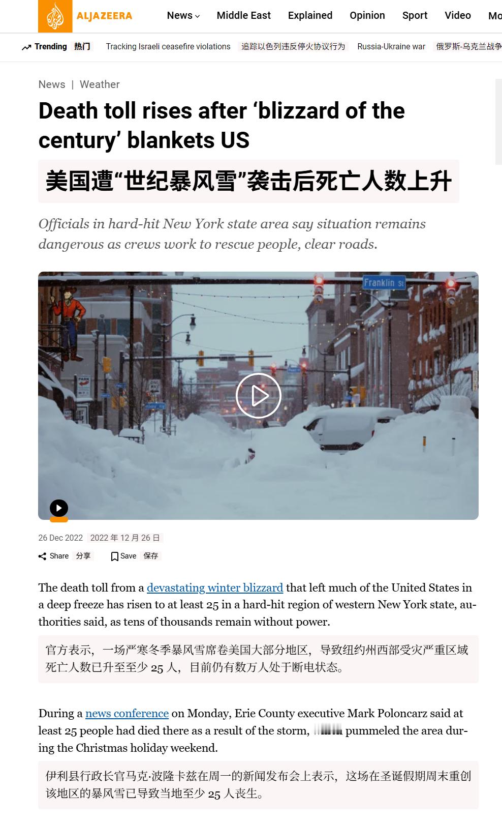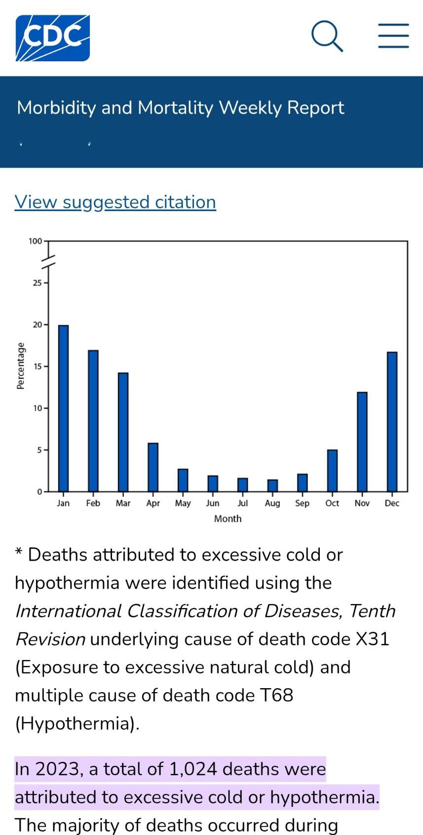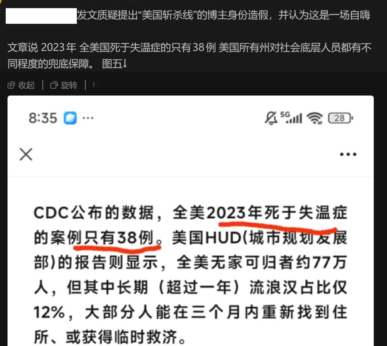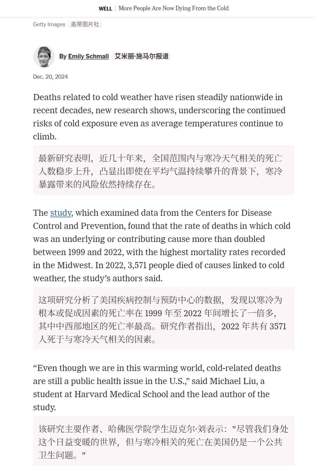 🔻有网友在微博分享了图1,图中称:“CDC 公布的数据,全美2023年死于低温症的案例只有38例”。🔻图2是 BBC、图3、4是半岛电视台。🔻图5是 美国 CDC,CDC说2023年美国因过度寒冷暴露(excessive natural cold)或低温症(hypothermia)导致的死亡人数为1024人。🔻此数据来自CDC的《发病率与死亡率周报》(MMWR)2025年发布报告,使用国际疾病分类代码(ICD-10)X31(过度自然寒冷暴露)和T68(低温症)统计,包括直接和相关死亡病例。这个数字仅限于死亡证书上明确标注为寒冷相关的病例,很显然是低估了实际影响的数字——因为许多寒冷加剧的心血管或呼吸疾病死亡未被归类为此。🔻图6则来自于《纽约时报》的报道,依然是基于美国 CDC 的数据,报道称 2022 年美国共有 3571 人死于与寒冷天气相关的因素。🔻我都不问“有没有撒谎”,统计学就是定义学嘛,是这样玩的吗?🔻“die with”和“die of”常看常新。🔻这对吗?美媒关注中国网友讨论美国斩杀线海外新鲜事热点现场