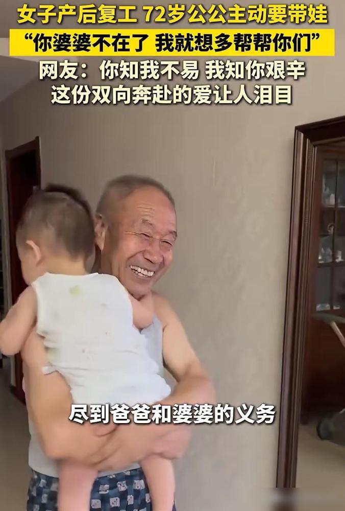 这样的公公全国罕见!陕西西安,女子产后准备复工,可始终放不下孩子,没想到,72岁的公公得知后,主动提出要带娃,而他给出的理由也是轻描淡写:你婆婆不在了,我就想多帮帮你!女子听到后感动的热泪盈眶。 其实这位宝妈当时心里正愁得不行,产假马上到头,一边是好不容易拼下来的工作,一边是离不开人的孩子。家里房贷车贷压力都不小,请育儿嫂开销太大,亲妈身体又不好,这种无助感真的能把人逼哭,没成想老爷子在这节骨眼上站了出来。 说实话,看到一个72岁的老人家,不仅没想过在家享清福,反而为了能带好娃,戴上老花镜去钻研那些复杂的育儿知识,心里真的挺受触动的。他甚至还专门备了个小本子,把冲奶温度、辅食添加这些细节记清清楚楚。 我觉得最难得的不是他愿意出力,而是他那种“空杯心态”。很多老人带娃容易固执己见,但他却愿意为了孙辈去重新学习科学育儿。这种学习劲头,大概就是咱们常说的,因为爱所以愿意改变吧。 老爷子的日常也是细致到了骨子里。每天天不亮就去早市挑最新鲜的菜,等小两口一出门,他就开启了“保姆+护士”模式:喂奶先试温、喂完必拍嗝,连孩子哭声代表啥意思都能摸得透透的,这心思比很多年轻人都要细。 特别戳我的细节是,他怕孩子午睡着凉,自己困得眼皮打架也不敢离开,就坐在旁边守着。这种“隔辈亲”里其实藏着老爷子对这个家深沉的责任感,他大概是想把老伴没能给出的那份爱,双倍补偿给孩子们。 我总觉得,这种父辈的支撑是带有某种“牺牲感”的。虽然他嘴上说得轻描淡写,但70多岁的高龄,体力和精力其实都已经很勉强了。他能这么坚持,其实是把儿女的难处看进了心里,宁愿自己受累,也不想孩子太难。 可能有人会觉得公公带娃不方便,但在这个家里,这种界限感早就被温情打破了。这种“无声的后盾”真的比任何豪言壮语都有力量,让在外面打拼的小两口能有个退路,回家能吃上一口热乎饭。 真的挺感慨的,这种中国式家长的付出,有时候真的不需要太多言语。希望这位宝妈能早点适应工作节奏,老爷子也能在忙碌之余保重好身体,这份家庭的向心力确实让人羡慕。