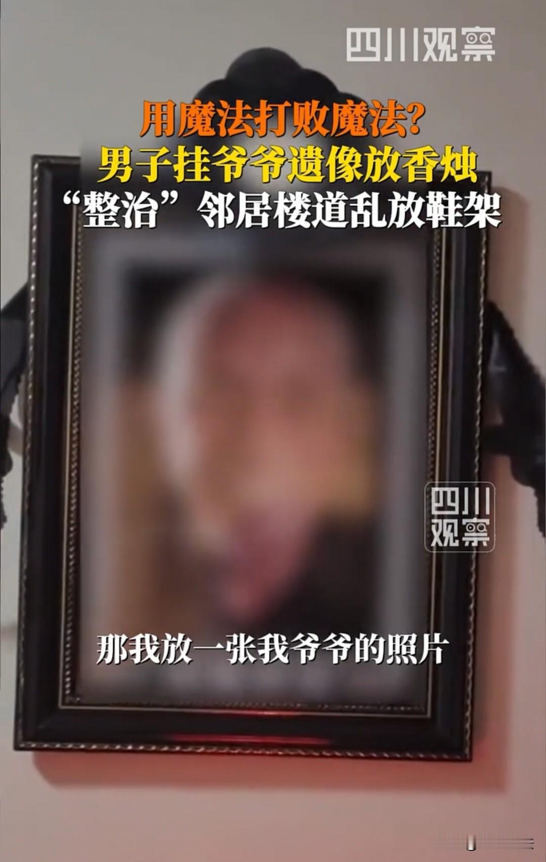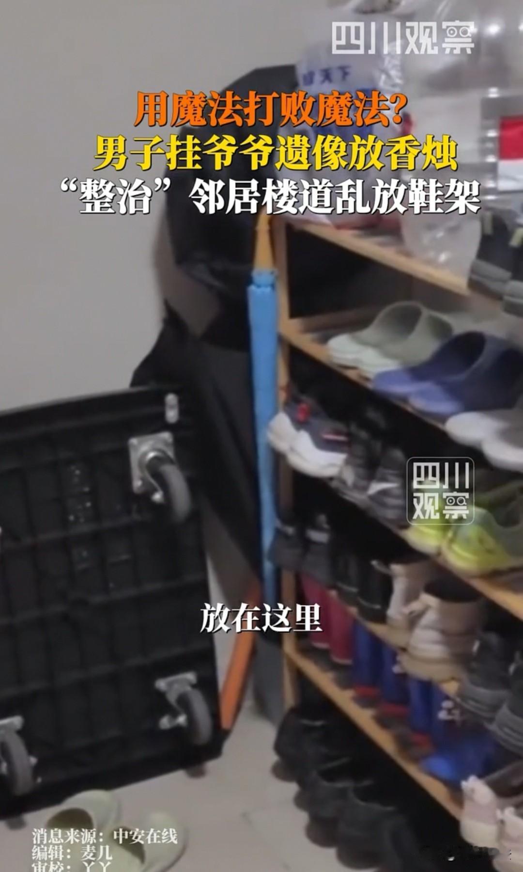 湖南,一小区里,邻居在楼道放鞋柜,男子便在楼道摆上爷爷的遗像,最后邻居赶紧拆掉鞋柜,男子也满意地收起爷爷的遗像,楼道恢复了往日的干净宽敞,网友们纷纷惊叹,男子的脑回路太绝了,真是一物降一物。 男子是个爱干净的人,他不仅把自家打扫得干干净净,也会把楼道收拾得整洁利落。可邻居却既不爱干净又比较自私,为了让家里更宽敞,竟把鞋柜摆到了门口。 这鞋柜虽没摆在男子家门口,但楼道是公共区域,男子看了格外膈应。几十双鞋子摆在外面,每天散发着浓郁的臭味,杂物也堆得乱七八糟,楼道俨然像个杂乱的菜市场,任谁看了都不舒服。 男子曾让物业通知邻居整改,可物业也束手无策——邻居说了不听,听了也不搬,事情最后不了了之。男子也清楚物业的难处,知道这家邻居就是看准大家好说话,能不搬就不搬。 男子也想像网友说的那样,直接把鞋柜扔掉,看邻居还敢不敢摆,可他不是喜欢用暴力解决问题的人,实在做不出这种事。 但每天看着对门乱糟糟的景象,他心里越发不爽,焦虑了几天后,突然冒出一个念头:既然你说鞋柜没摆到我门口,与我无关,那我把爷爷的遗像摆在门口,再点几柱香,这总跟你们没关系吧? 想到就做,男子拿出爷爷的遗像,还对着遗像说了些对不起的话,说要借用爷爷的画像对付一下对面的邻居。 随后他拿钉子在墙上钉好,挂上爷爷的照片,又在下方摆了一张桌子,放上几柱香和几根蜡烛,一切布置妥当后,便静静关注着邻居的动静。 他心想,要是邻居敢动爷爷的遗像分毫,他就有理由、有底气去动对方的鞋柜;要是邻居不动,那大家就各自摆着,看谁耗得过谁。 这天男子回家,一眼就看到楼道里的鞋柜不见了,公共区域也被打扫得干干净净,他立刻明白邻居服软了。 正想着,邻居开门说道:“嘿,我们都把东西搬进去了,你也把你这东西收进去吧,以后公共地段咱都别放东西了。” 男子本就只是想让邻居整改,既然对方服软,他赶紧把爷爷的遗像请回了家,桌子也一并搬了回去。 事后他把这件事拍成视频发布出来,称自己也是无奈之举。 邻居也坦言,其实自己放鞋柜本就没摆在男子门口,可架不住男子使出这一招,只能赶紧搬走。 经此一事,邻里间恢复了和睦,大家也约定好共同维护公共区域的环境卫生。 网友们看到男子的办法,纷纷表示这真是“用魔法打败魔法”:见过扔鞋柜的、和邻居大吵大闹的、报警或找物业处理的,却从没见过用爷爷遗像制服邻居的。 邻居在楼道放鞋柜,肯定是违法的行为! 《民法典》第二百七十一条明确说了,楼道是全体业主的共有区域,不是某一户的私人储物间,没人能擅自占用; 《民法典》第二百八十六条还规定,侵占通道损害他人权益的,得停止侵害、恢复原状。而且楼道还是消防通道,这么堆鞋子杂物,本身就违反了《消防法》,一旦出事会耽误逃生,违规了还可能被罚款。 男子挂爷爷遗像反击,不算直接违法,但真不提倡。他没辱骂威胁邻居,不算侵权,可公共区域摆遗像容易让其他邻居不适,还可能闹出新矛盾。 这件事里,物业、业委会以及社区其实该负起主要协调责任。业主没有执法权,遇到邻居占用公共区域的问题,没法直接强制整改,只能求助于这些管理和服务机构。 物业应依据《民法典》第二百八十六条,履行对小区公共区域的管理职责,主动制止并督促违规邻居整改; 业委会和社区则要发挥调解作用,牵头组织双方协商,而不是把解决问题的压力全部推给受害业主,让业主不得不靠私力对抗来维权。 对于此事,大家如何?四川观察:2025年12月26日