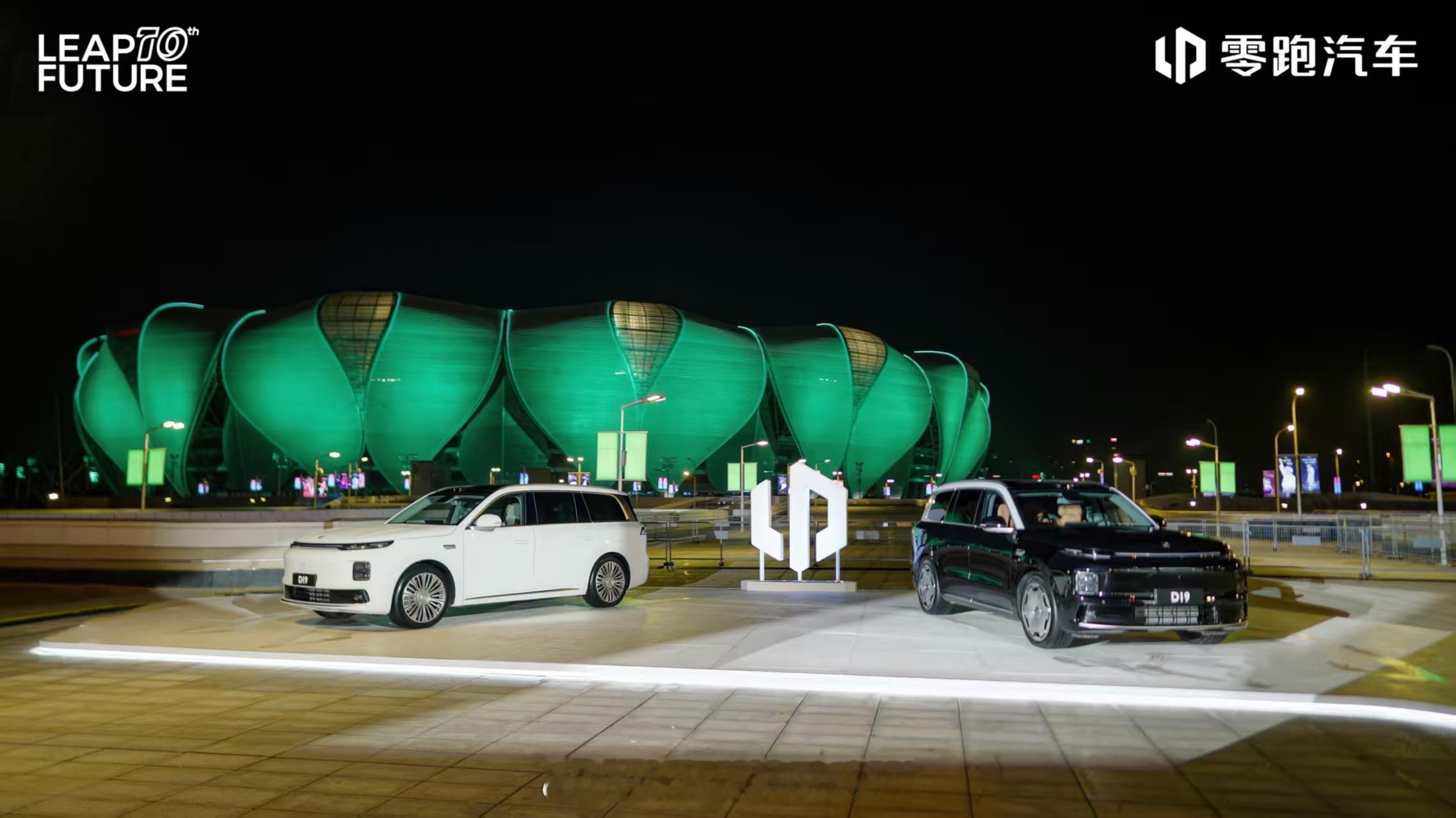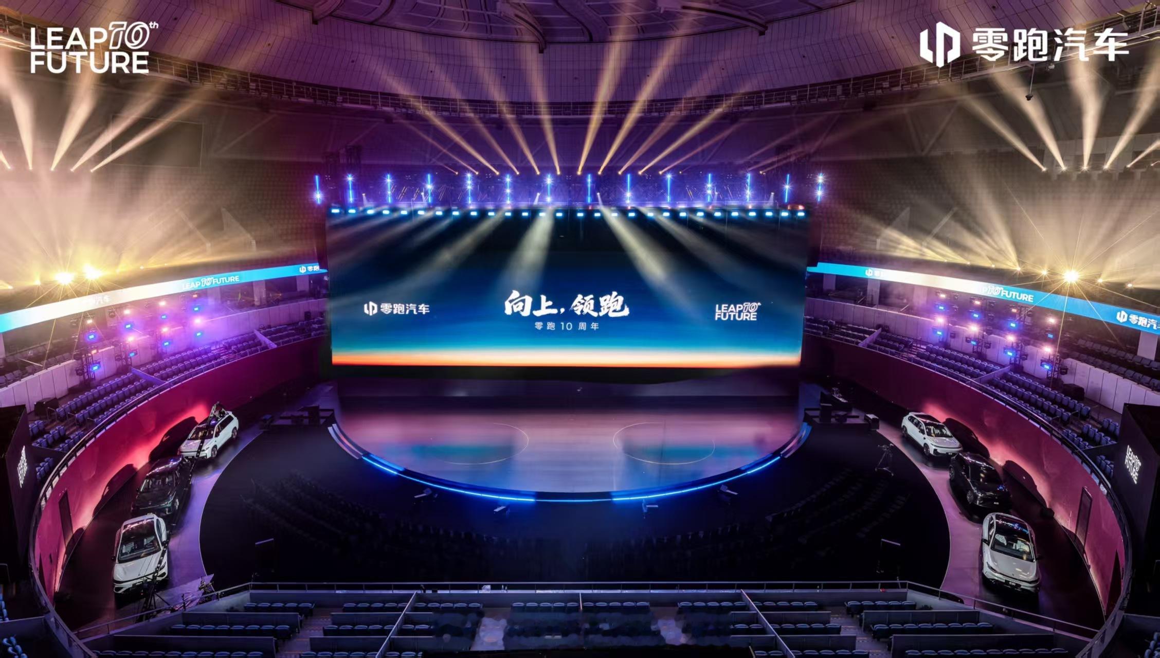 零跑10周年发布会发布会马上开始了,以“大莲花”为背景光影交错,这个布置很用心啊!